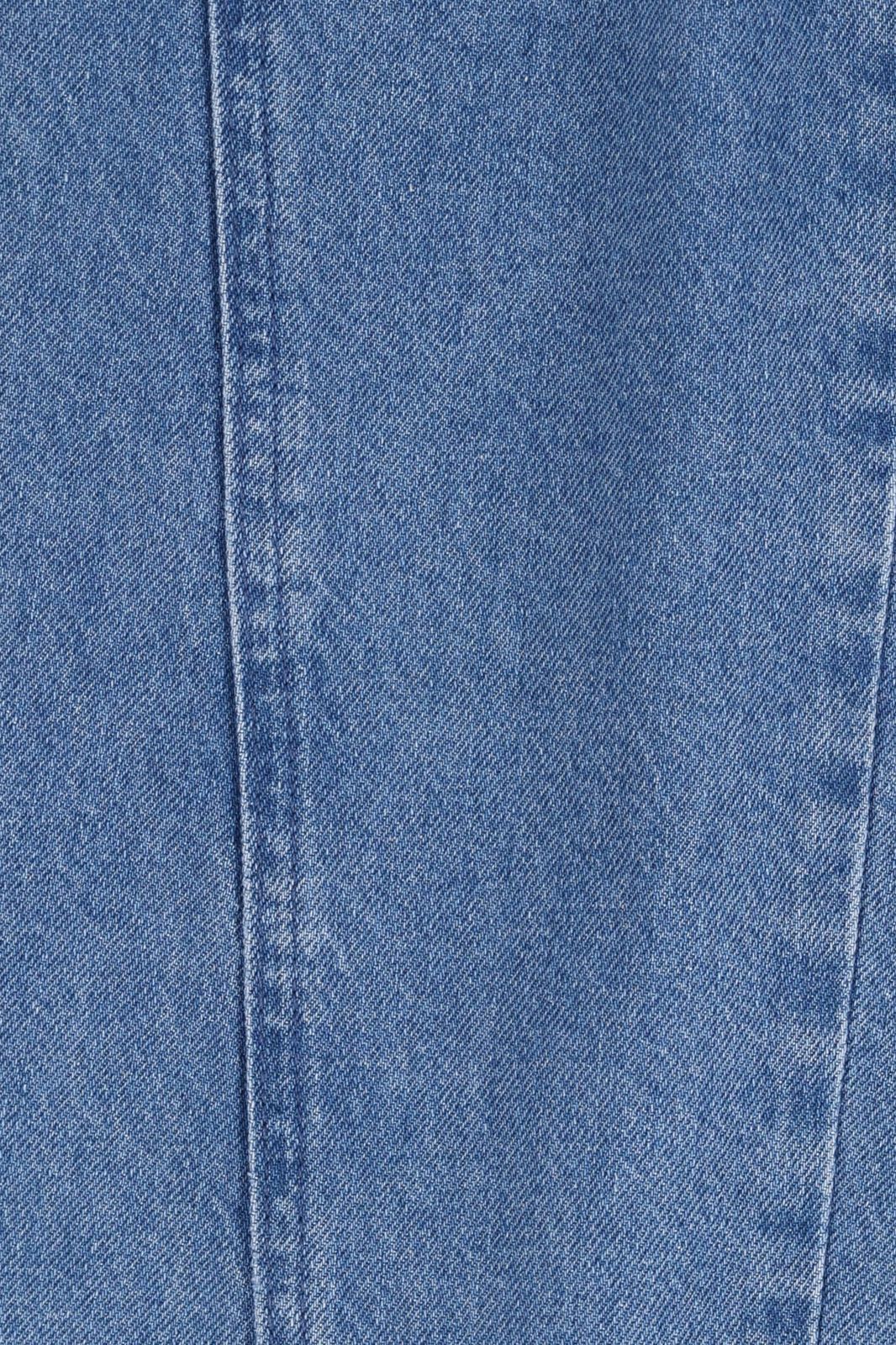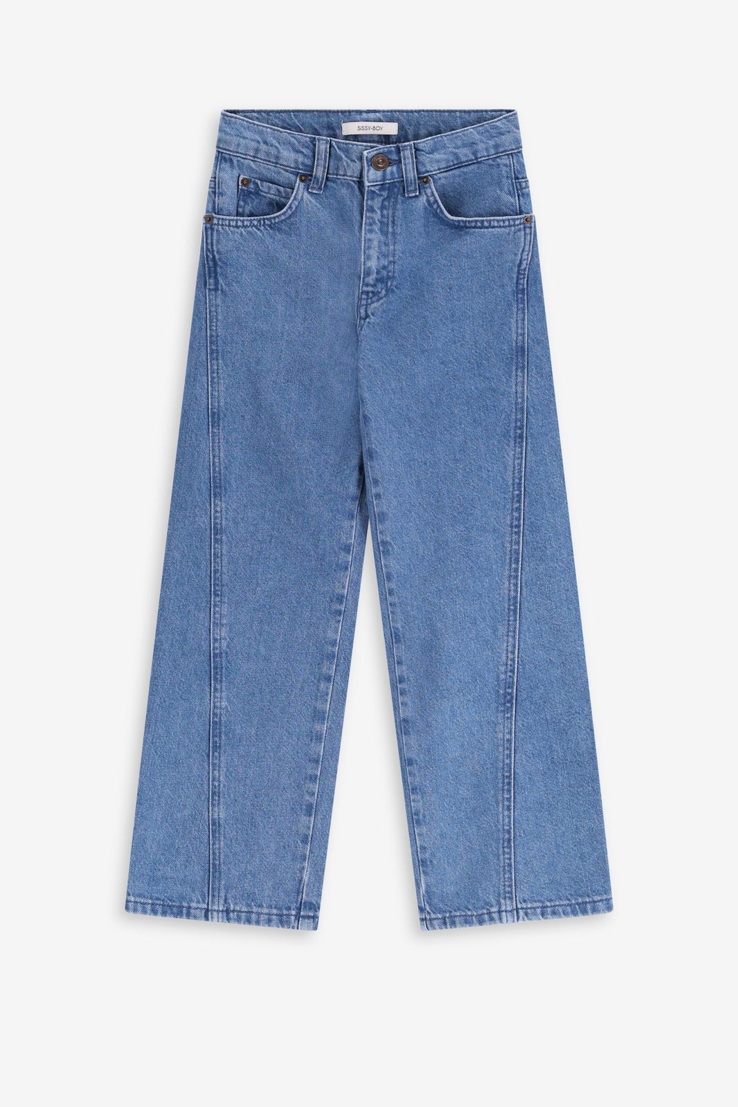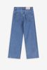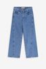 Jean bleu avec des jambes larges, 5 poches, une fermeture éclair et un bouton. Composition : 100% coton.