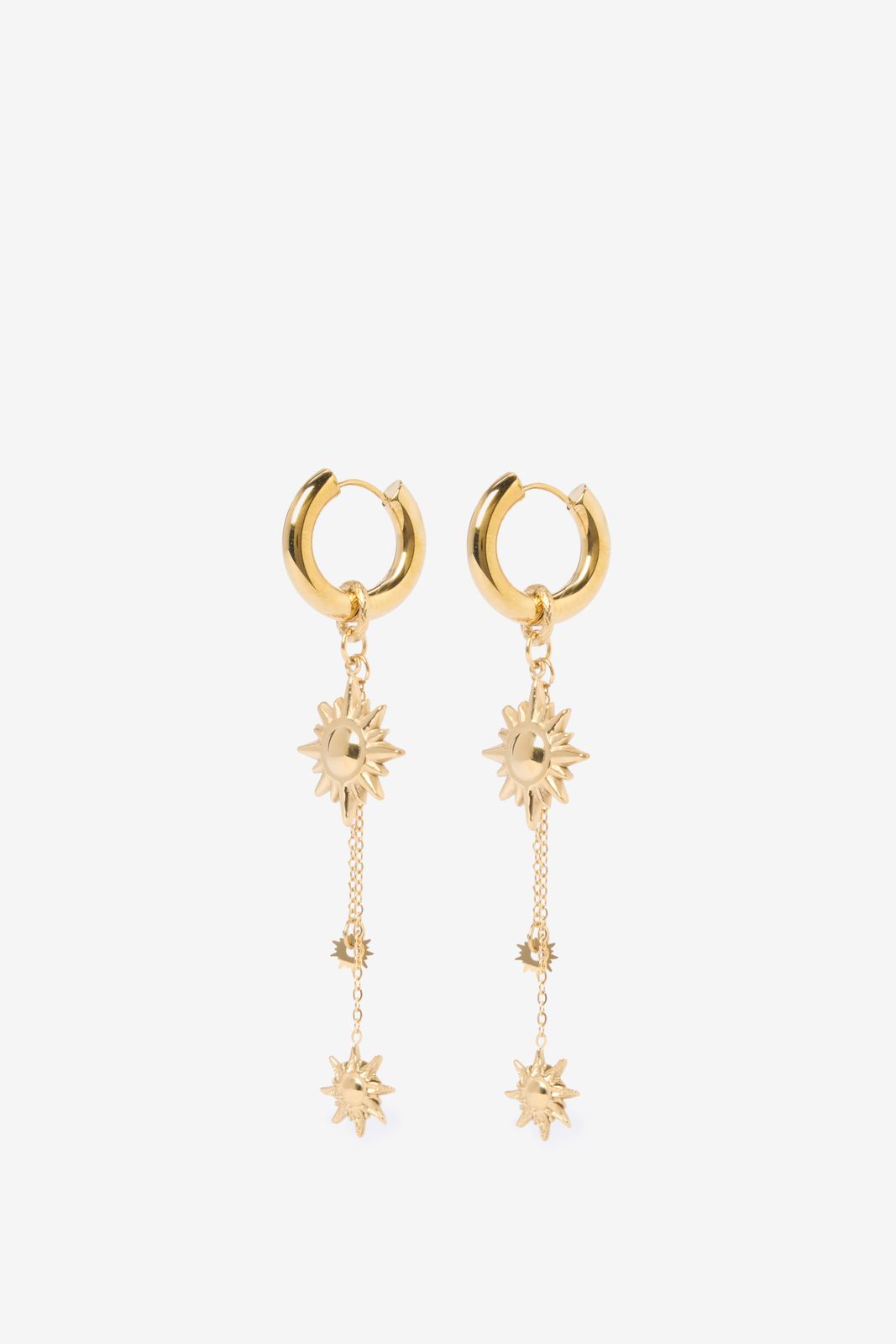 Boucles d'oreille plaqué or de Sissy-Boy. Les boucles d'oreille sont composées d'un anneau avec trois petits soleils de différentes tailles. Entretien bijoux Sissy-Boy : Évitez tout contact avec des produits cosmétiques (parfum, laque, démaquillant, dissolvant, huile de corps, crème solaire, gel désinfectant pour les mains et déodorant). Ne portez pas les bijoux sous la douche, dans le bain ou lorsque vous vous baignez. Le chlore, en particulier, peut endommager ou décolorer de façon permanente les bijoux. Dimensions : 8x2 cm. Composition : 100% acier.
