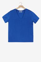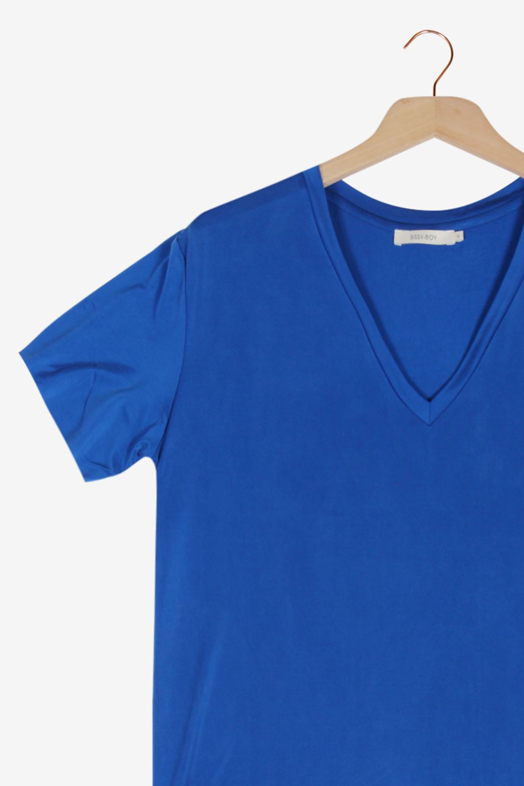 Dit kobalt blauwe T-shirt met V-hals is gemaakt van 90% crupo en 10% elastaan. Omdat het t-shirt gemaakt is van crupo is het ademend en absorberend en kan deze donkere kleur prima gedragen worden in de zomer. Een basic die je in je kast moet hebben!