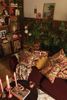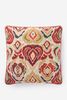 Coussin rouge de Sissy-Boy. Le coussin est orné d'un imprimé ikat avec des détails vert menthe et roses. Dimensions : 50x50 cm. Composition : 80% polyester, 20% coton.