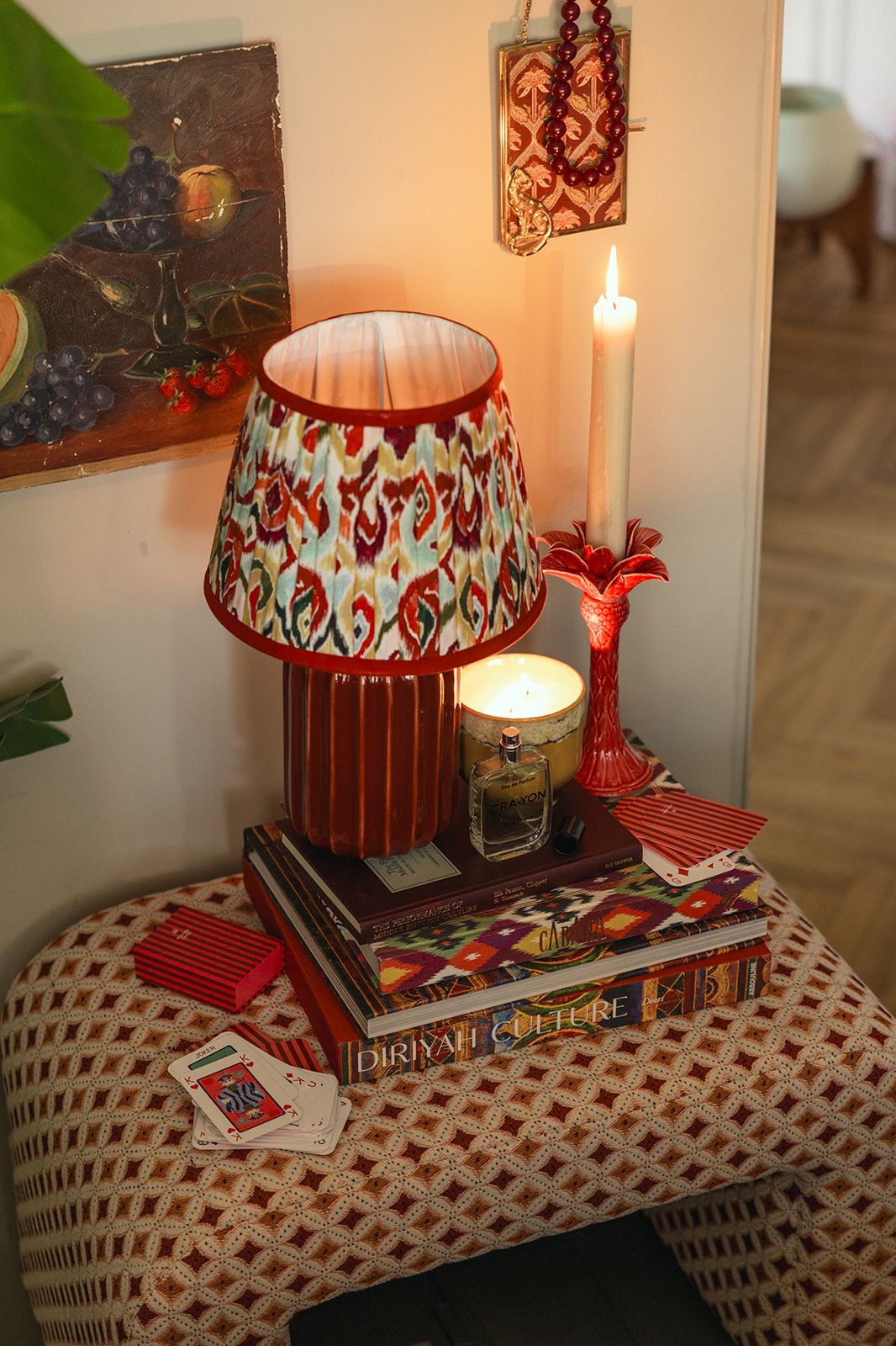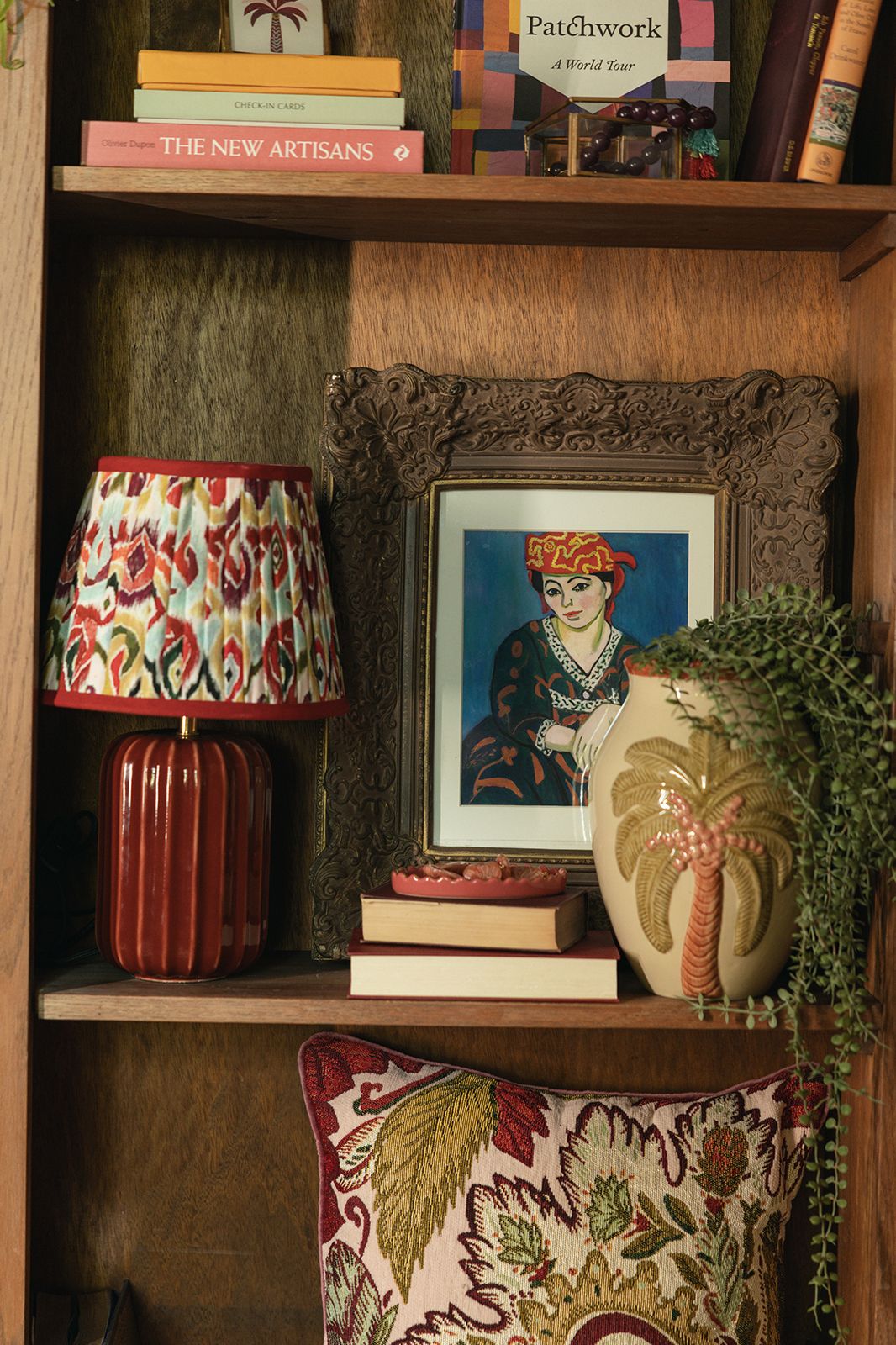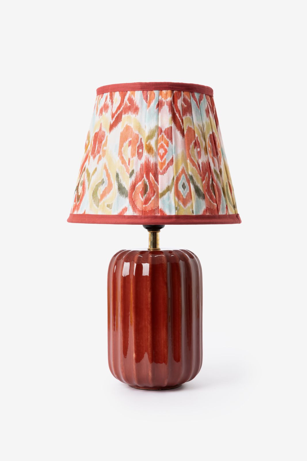 Lampe à poser rouge foncé de Sissy-Boy. La lampe a un socle rouge foncé et un abat-jour orné d'un imprimé ikat coloré. La lampe a une puissance de 25 watts, mesure 25x25x40 cm et un indice de protection de 20, ce qui signifie qu'elle est adaptée à un usage intérieur. Composition : 100% céramique.