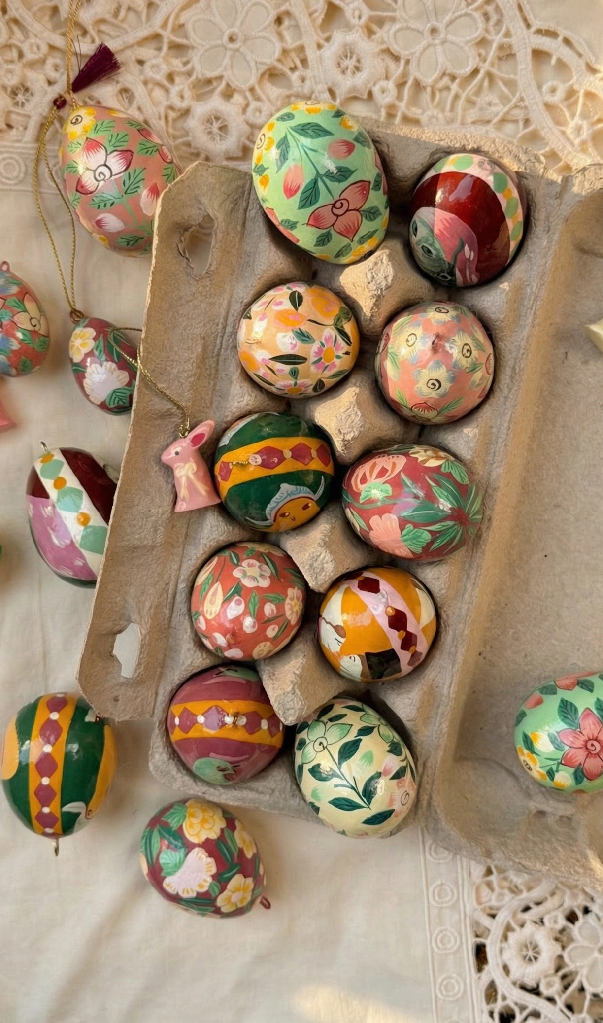 Faites briller votre table de Pâques avec notre collection colorée de décorations. Des petits cœurs de Pâques peints à la main aux suspensions de Pâques joyeuses : chaque article est conçu avec soin pour rendre votre fête encore plus spéciale. Mais les articles spécifiquement dédiés à Pâques ne sont pas les seuls à contribuer à une table festive. Pensez aussi aux chandeliers colorés, aux bougies et à une belle vaisselle. Associez des matériaux naturels à des couleurs vives pour créer une atmosphère chaleureuse de Pâques.