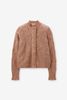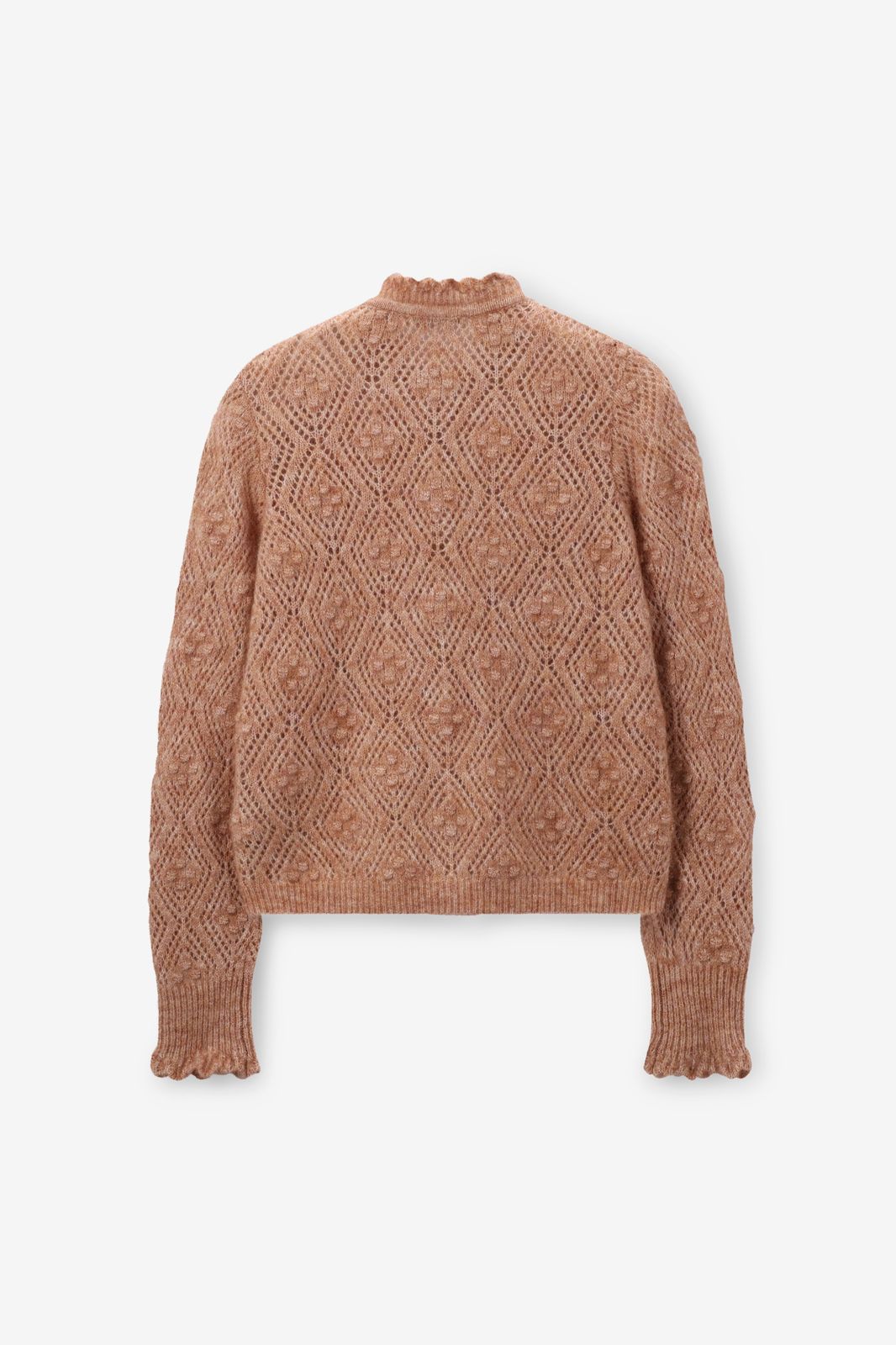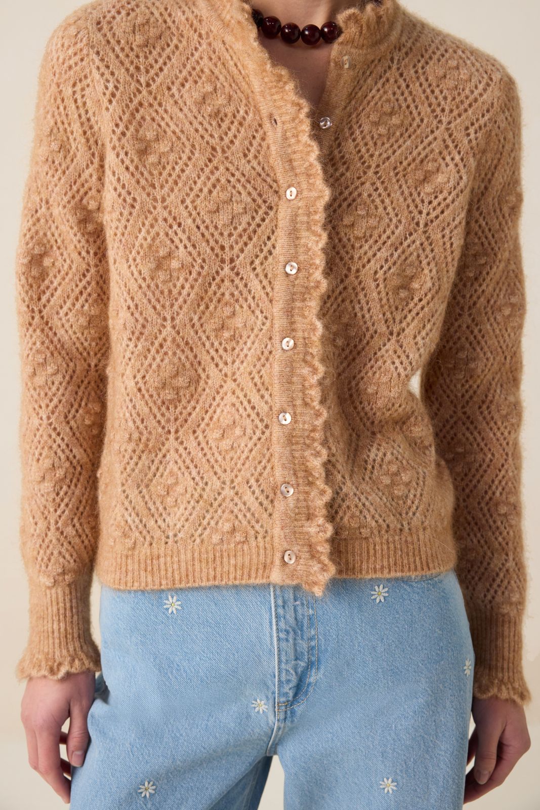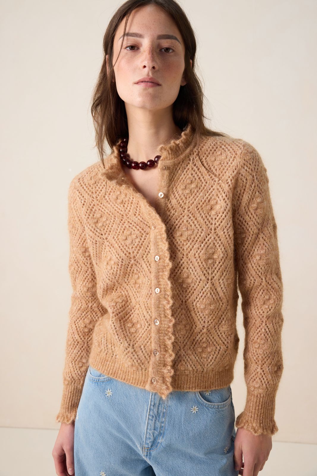 Beige ajour vest van Sissy-Boy. Het vest heeft lange mouwen, ribboorden, knoopsluiting en een regular fit. Verder heeft het vest een all-over opengewerkt ajour patroon in de stof verwerkt en ruffles rond de uiteinden. Het model heeft een lengte van 1,77 en draagt maat S. Materiaal: 33% mohair 33% wol 28% nylon 6% elastaan.