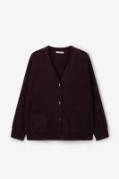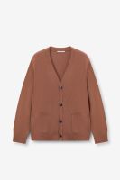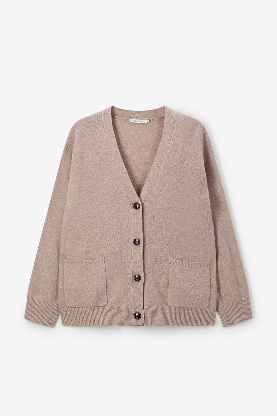 Beige vest met V-hals van Sissy-Boy. Het vest heeft lange mouwen, een V-halslijn, een knoopsluiting en ribboorden bij de hals, mouwen en onderzijde. Daarnaast heeft het een bruine kleur met opgestikte zakken aan de voorzijde. Materiaal: 50% wol, 50% yak.