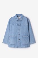 Blauw denim jack van Sissy-Boy. Het jasje heeft lange mouwen, een hoge halslijn, een kraag, een knoopsluiting en denim-kwaliteit. Verder heeft het jasje twee zakjes aan de voorzijde en een oversized fit. Materiaal: 100% katoen.