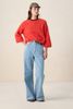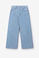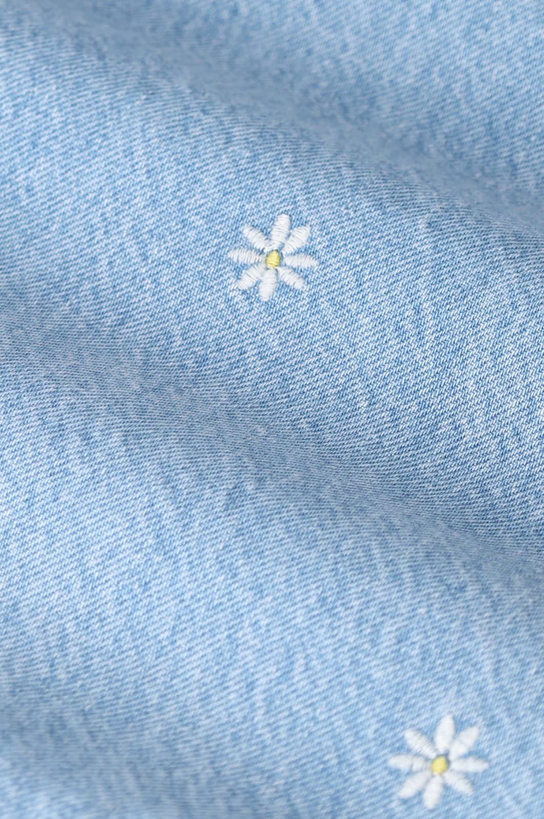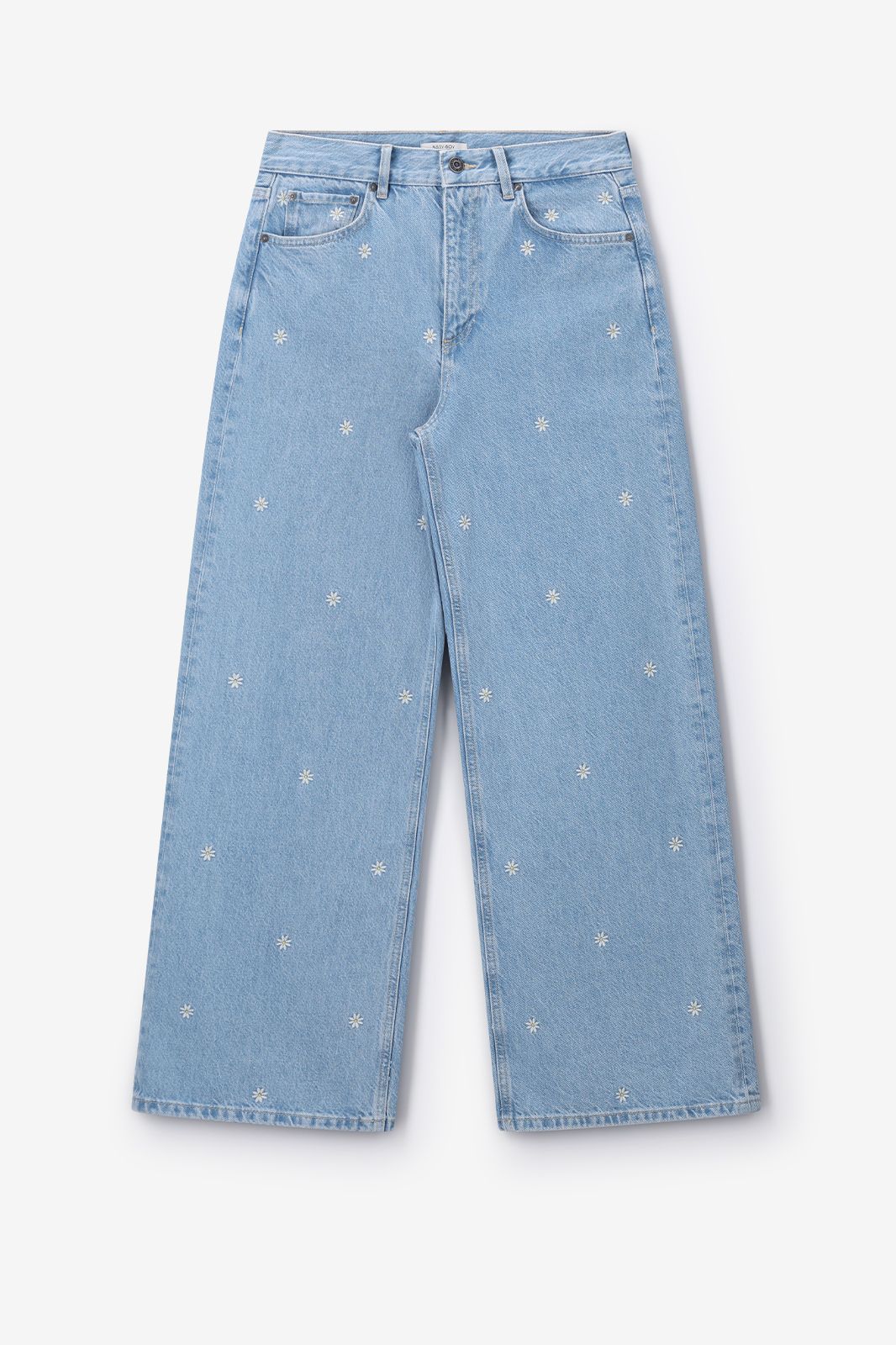 Blauwe high rise wide leg jeans met bloemen van Sissy-Boy. De denim broek heeft een hoge taille, 5-pocket model, wijd uitlopende broekspijpen en een knoop- en ritssluiting. Verder heeft de broek een lichtblauwe wassing en een all-over embroidery bloemetjes design. Het model heeft een lengte van 1,77 en draagt maat 28. Materiaal: 100% katoen.