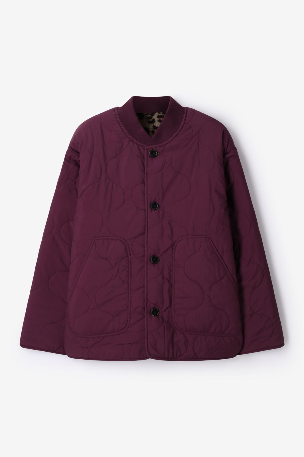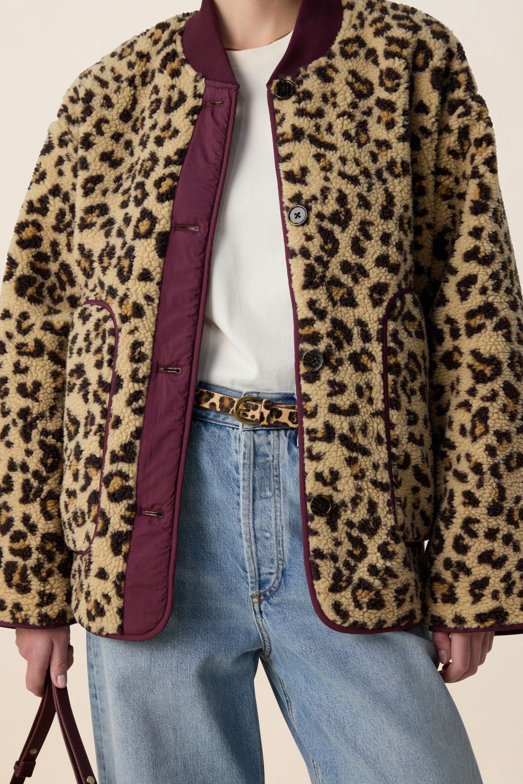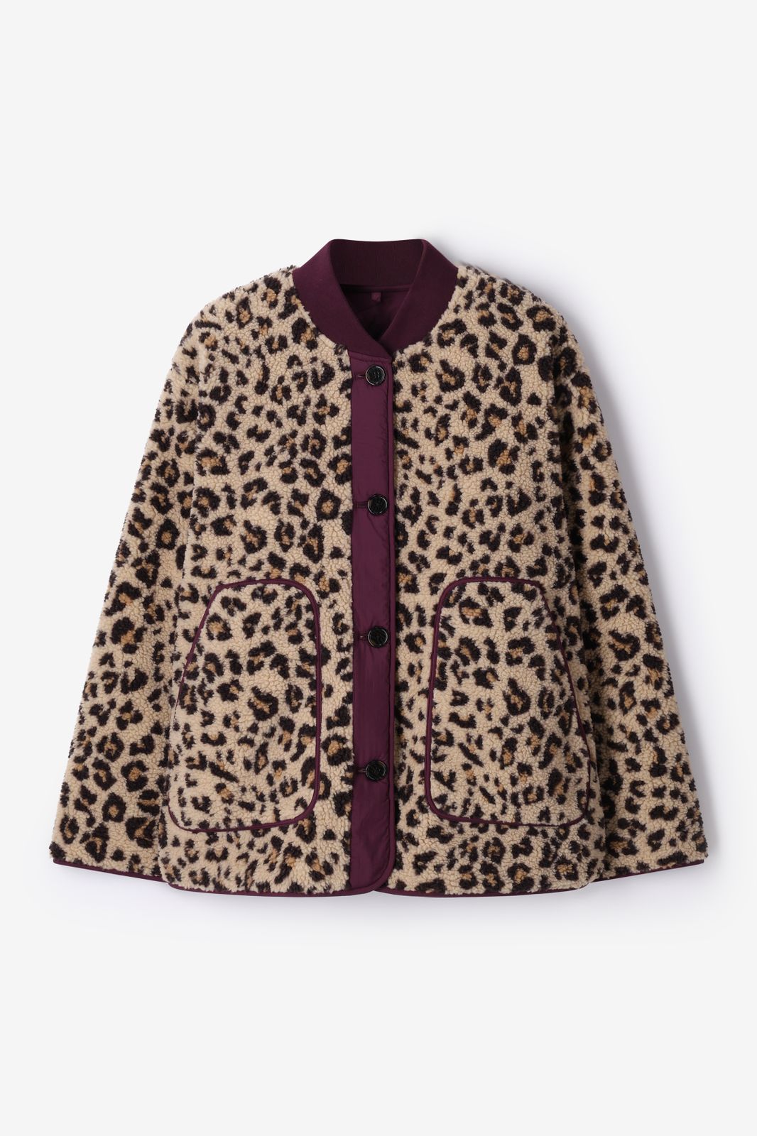 Bruine reversible teddy jas met leopard print van Sissy-Boy. De jas heeft lange mouwen, een hoge hals, een knoopsluiting, verlaagde schouders en opgestikte zakken. Verder is de jas reversible en op twee manieren te dragen. De ene kant is gemaakt van een teddy stof met leopard print en de andere kant heeft een donkerpaarse quilted look. Materiaal: 100% polyester.