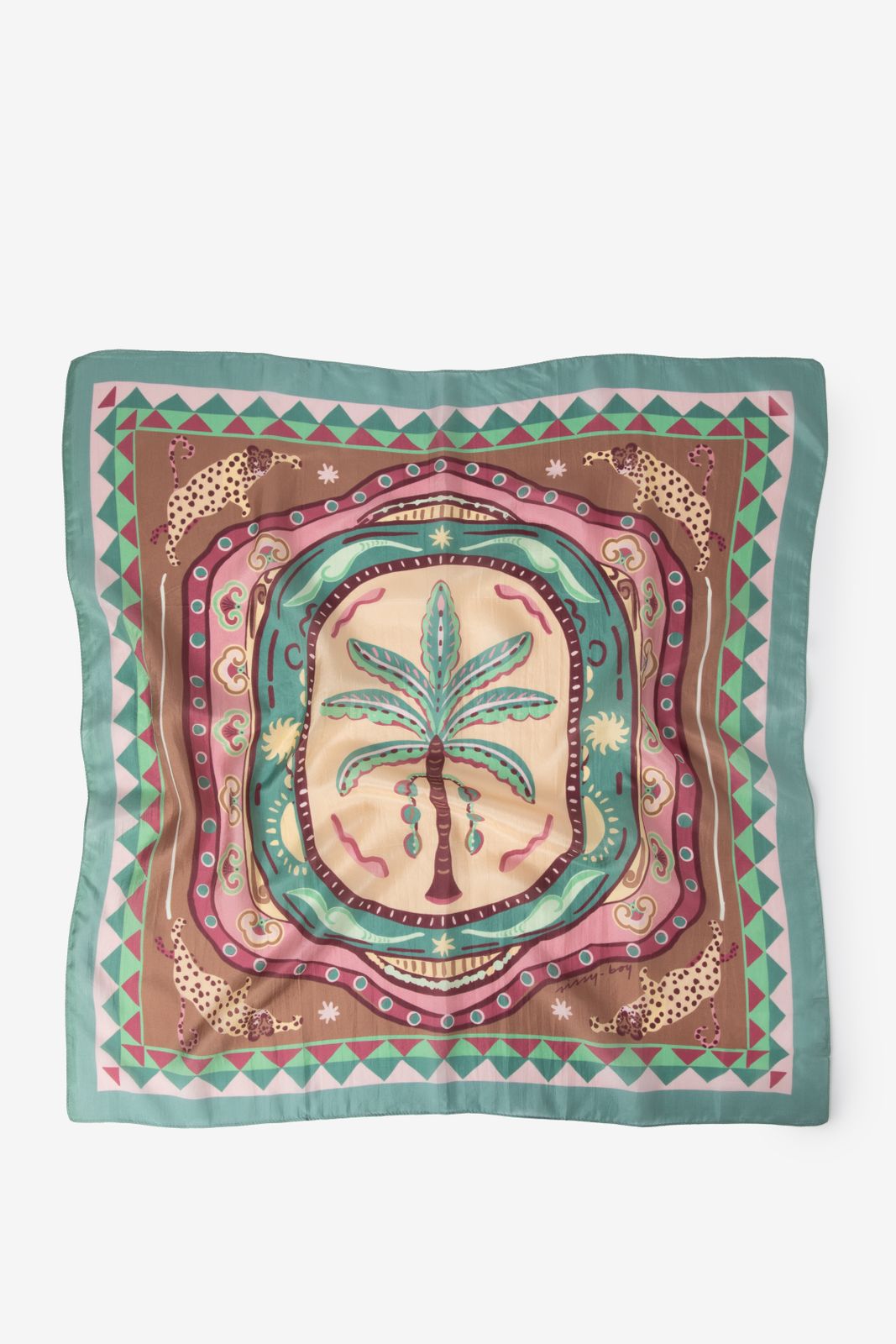 Bruine sjaal met print van Sissy-Boy. Deze sjaal heeft een glanzende kwaliteit en is bedrukt met een all-over leopard print met palmboom details. Afmetingen: 68 x 66 cm. Materiaal: 100% zijde.