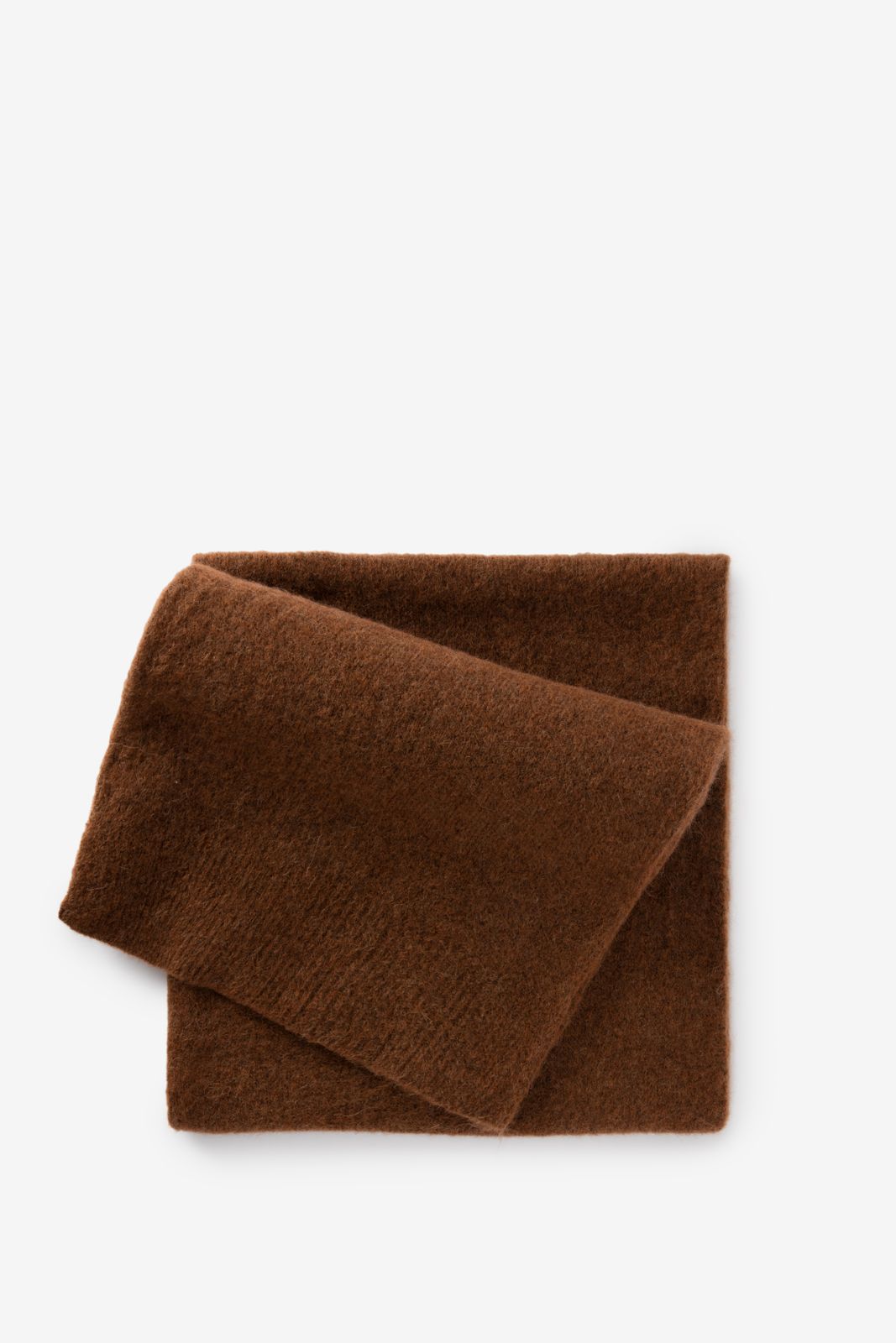 Bruine wollen sjaal van Sissy-Boy. De sjaal heeft een bruine kleur en een ribboord. Materiaal: 48% alpaca, 28% polyamide, 21% wol, 3% elastaan.