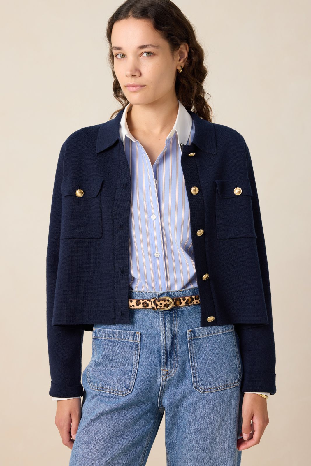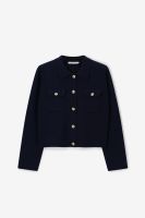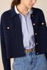 Donkerblauw vest met gouden knopen van Sissy-Boy. Het vest heeft lange mouwen, een kraag, een knoopsluiting, borstzakken en een regular fit. Daarnaast heeft het een blauwe kleur met chique gouden knopen. Materiaal: 100% merino wol.