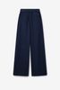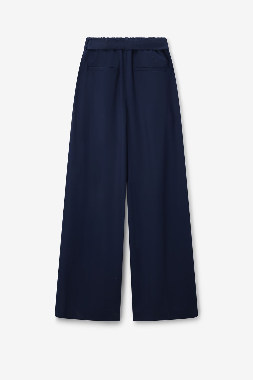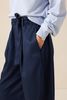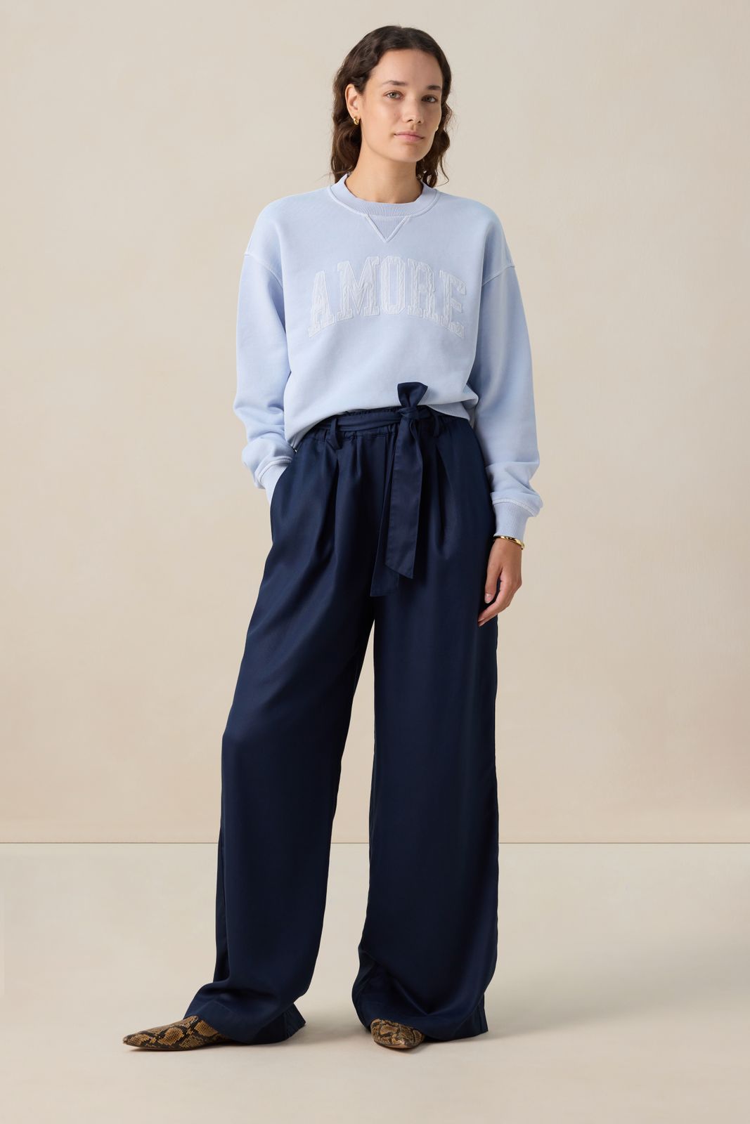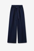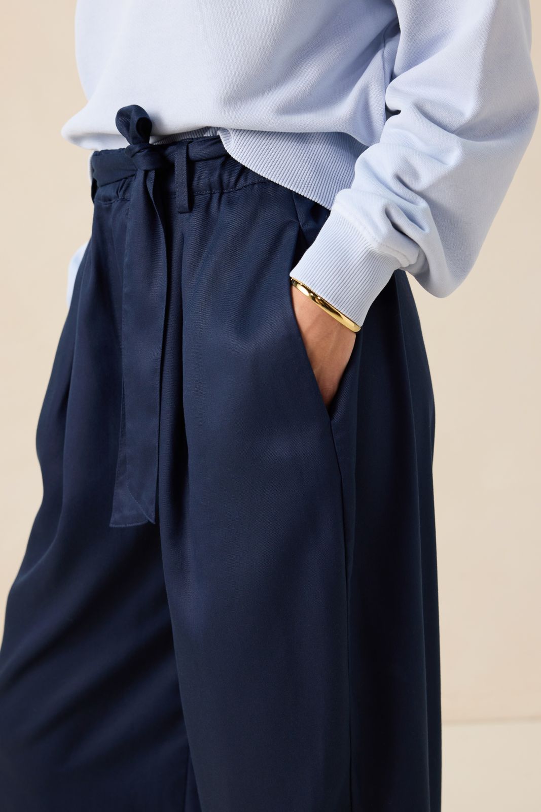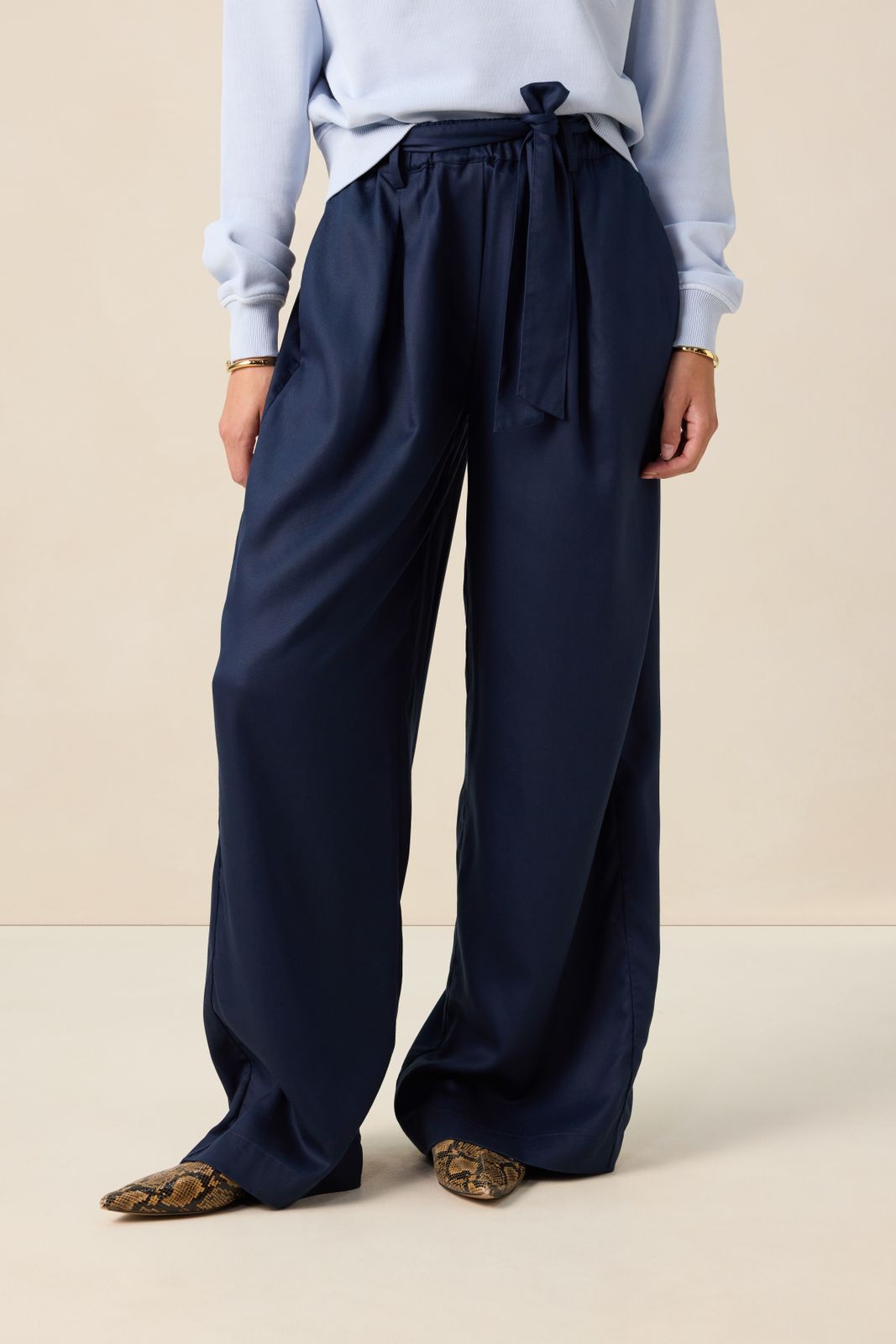 Donkerblauwe high waist wide leg broek van Sissy-Boy. De broek heeft een hoge taille, een elastiekenband in de taille, wijd uitlopende broekspijpen, steekzakken en een regular fit. Daarnaast heeft het een riem in de taille om te knopen. Het model heeft een lengte van 1,74 m en draagt maat S. Materiaal: 100% lyocell.