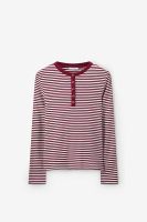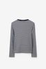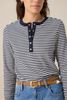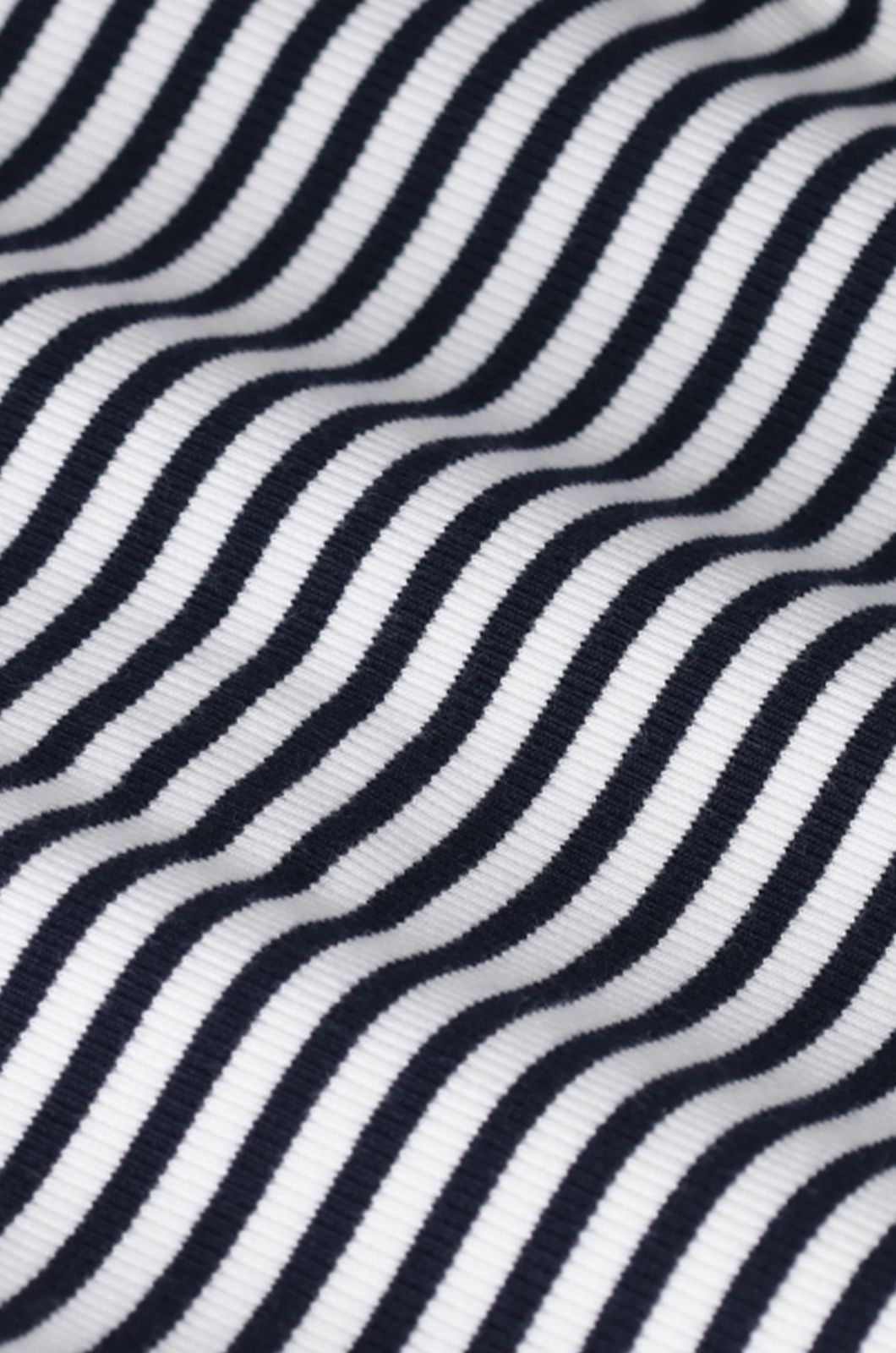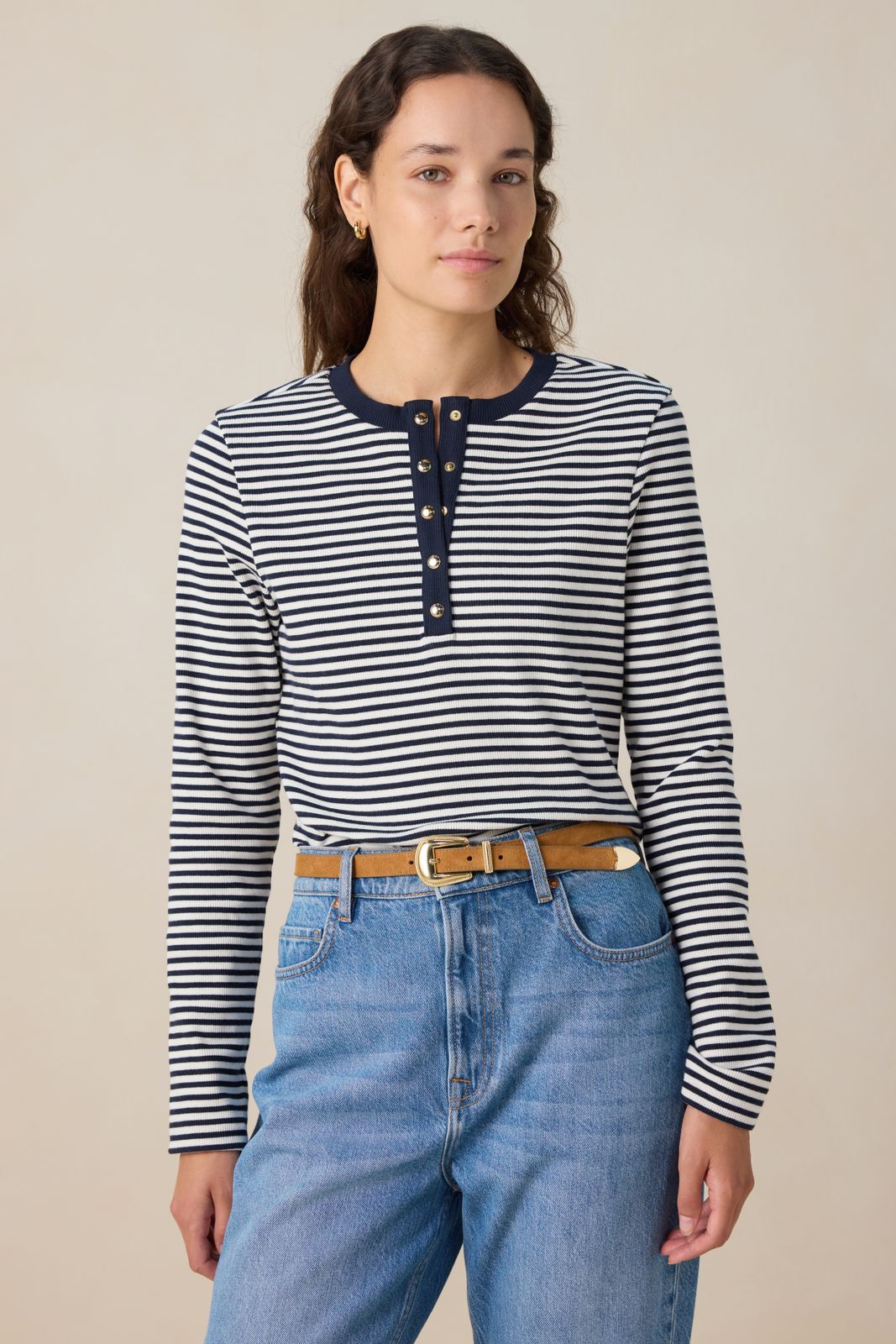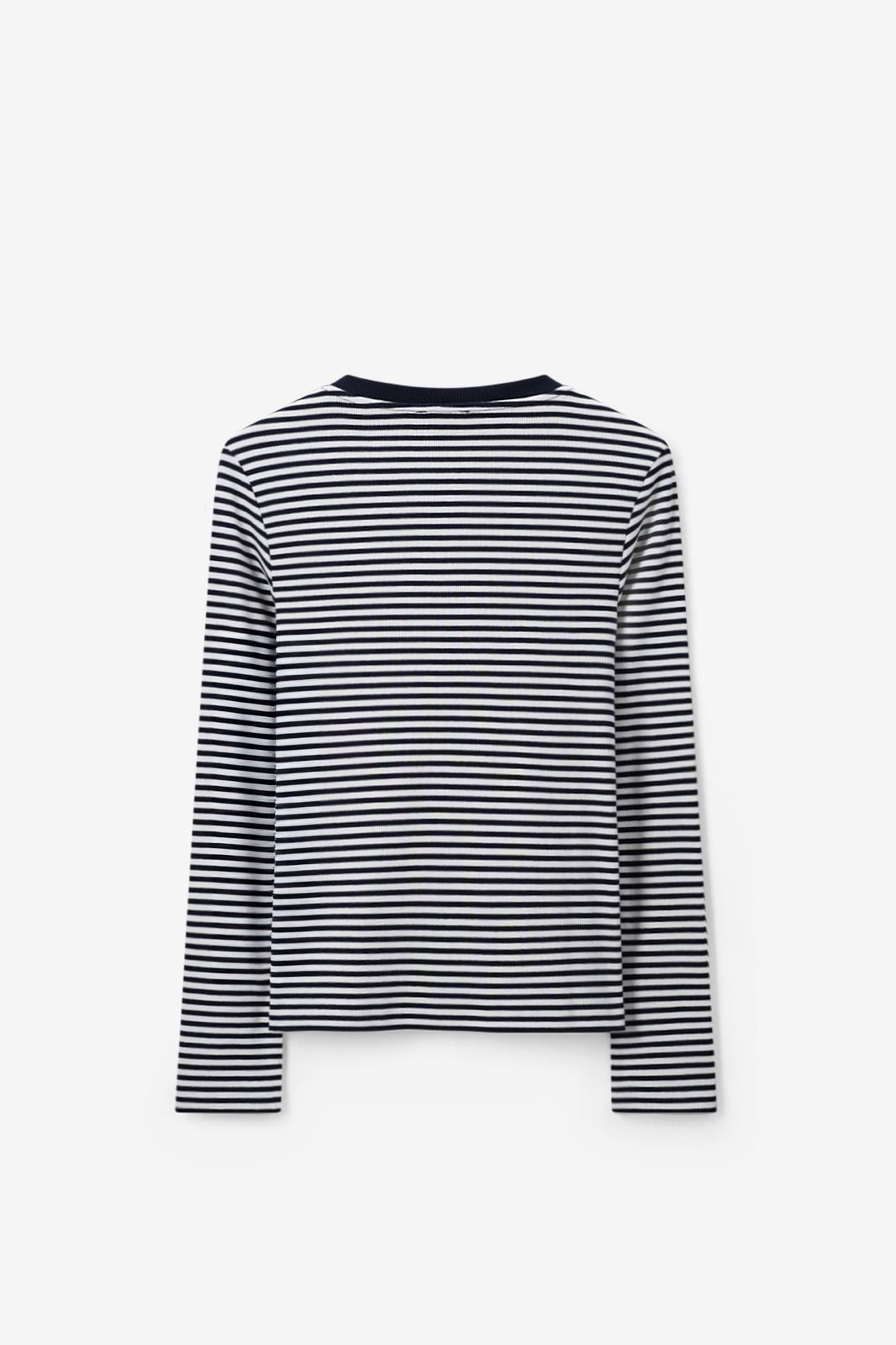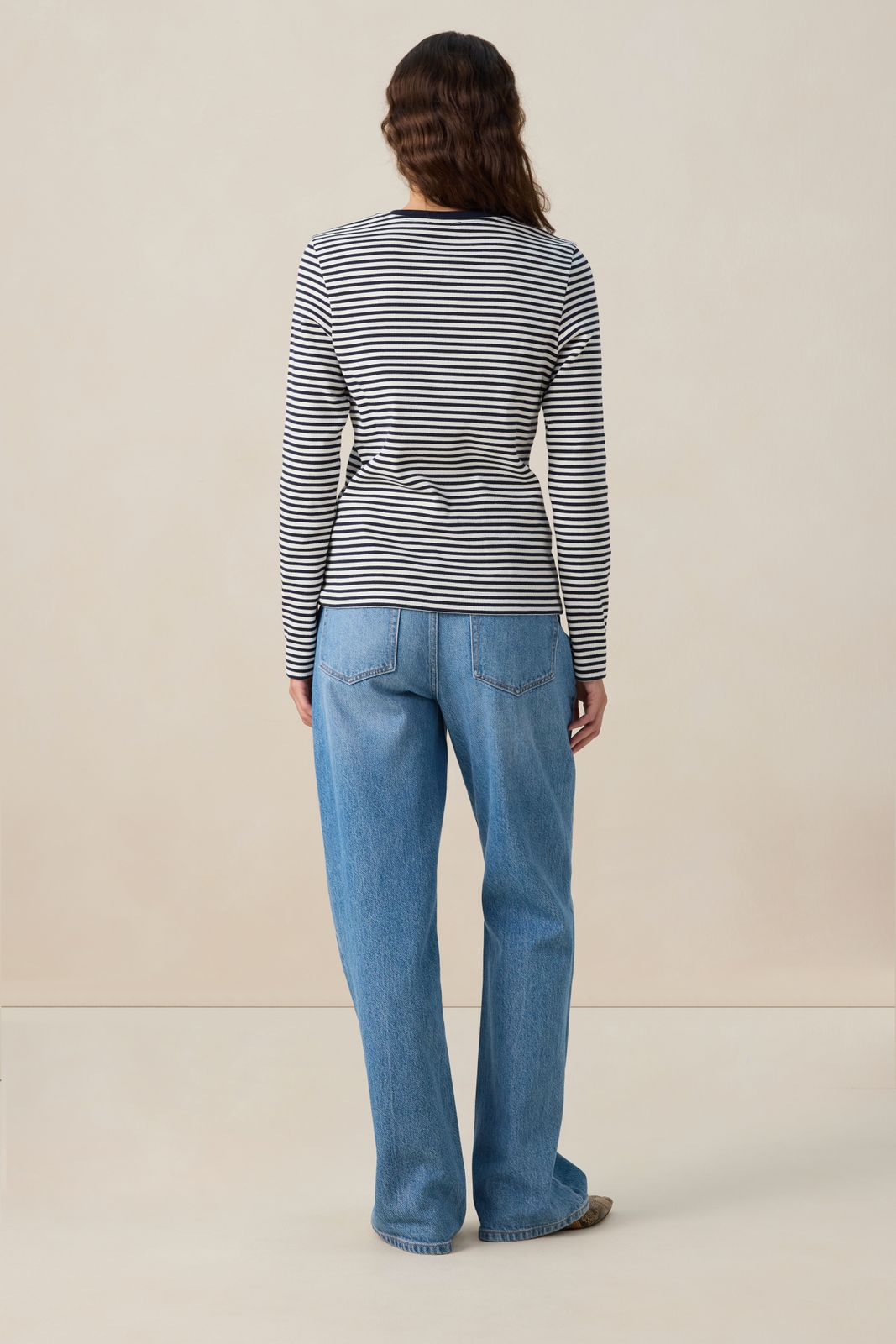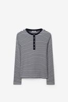 Donkerblauwe longsleeve met strepen van Sissy-Boy. Het T-shirt heeft lange mouwen, een hoge ronde halslijn, knoopsluiting en een aansluitende fit. Daarnaast heeft het een blauwe kleur met all-over horizontale witte strepen. Het model heeft een lengte van 1,74 m en draagt maat S. Materiaal: 95% katoen, 5% elastaan.