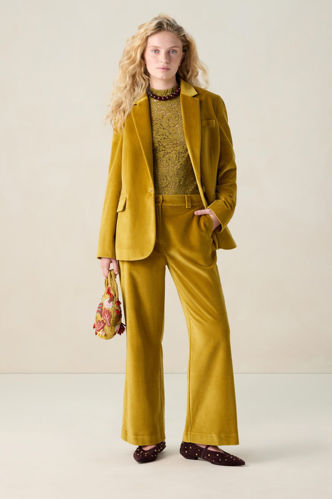 Gele cropped broek van Sissy-Boy. De broek heeft een middelhoge taille, cropped broekspijpen en een knoop-en ritssluiting. Verder is de broek een 5-pocket model met twee steekzakken aan de voorzijde en twee opgestikte zakken aan de achterzijde. Het model heeft een lengte van 1,71 m en draagt maat S. Materiaal: 100% katoen.
