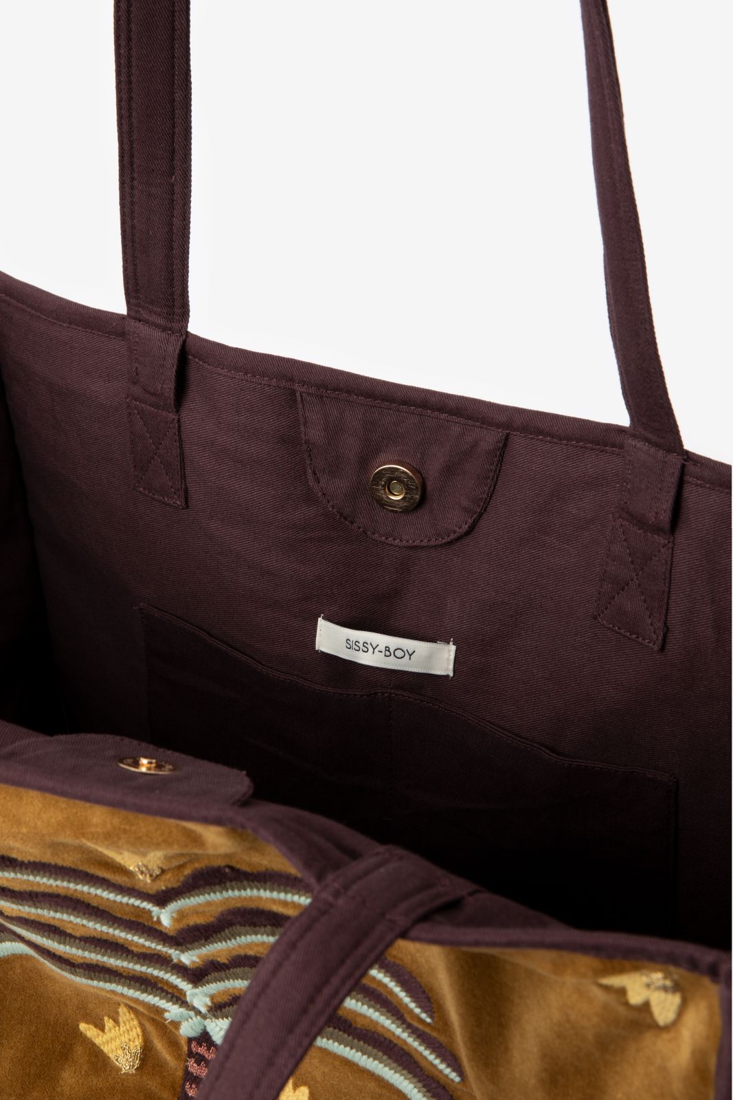Donkergroene velvet shopper met embroidery van Sissy-Boy. De shopper heeft een donkergroene kleur, een magnetische drukknoopsluiting en is gemaakt met een velvet kwaliteit stof. Afmetingen: 29 cm x 40 cm x 20 cm. Lengte hengsels: 64 cm. Materiaal: 100% katoen.