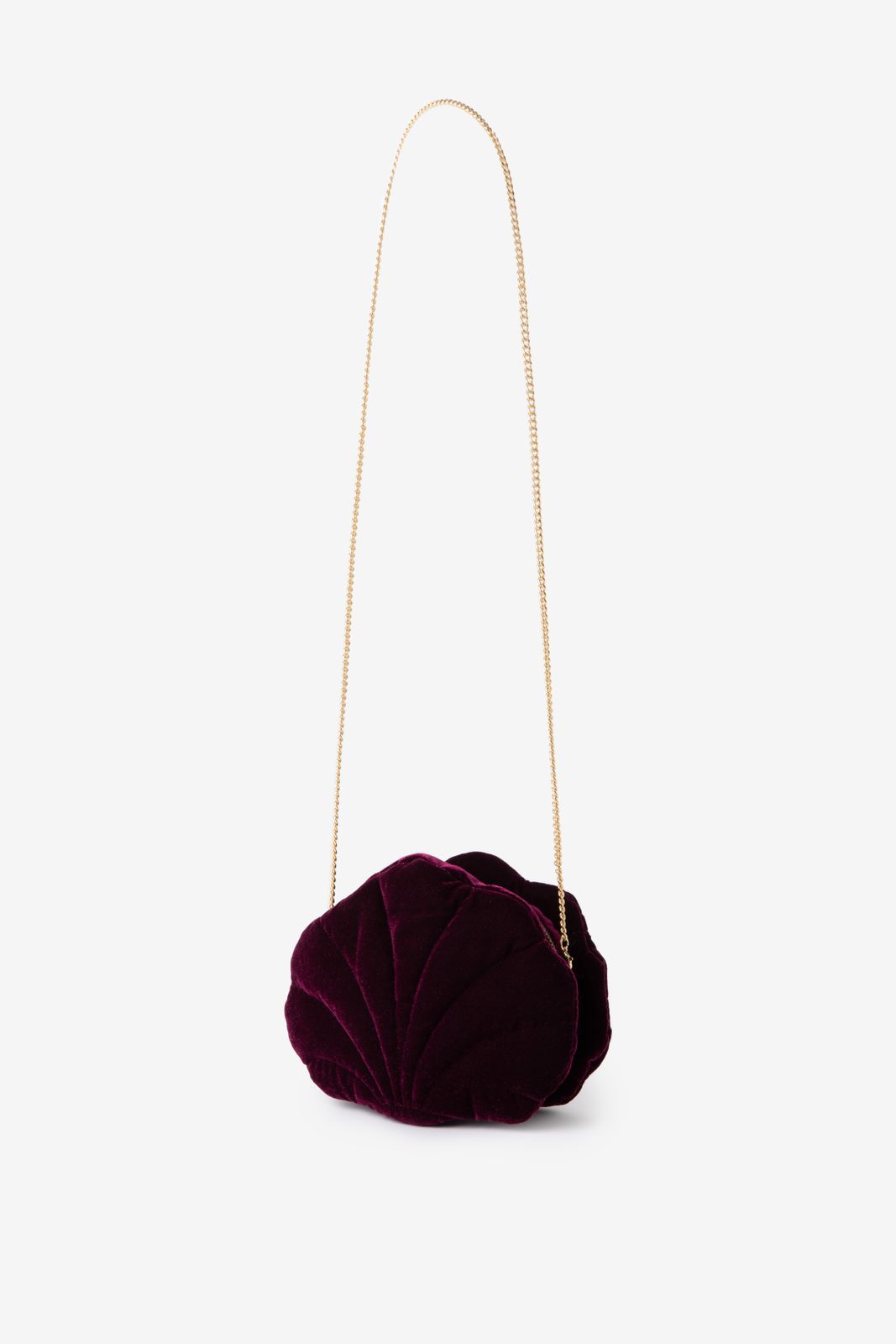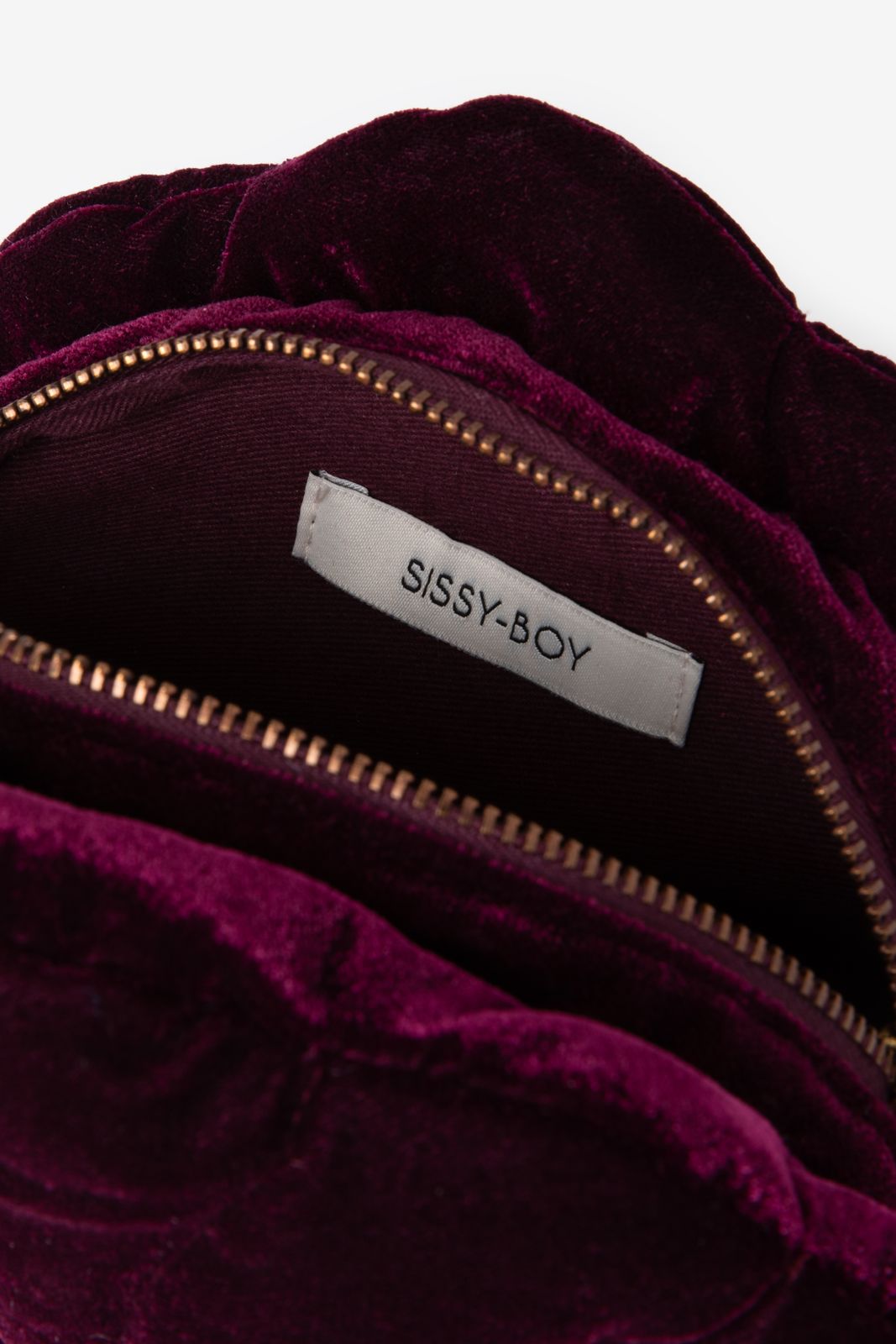 Donkerpaarse schelpvormige velvet tas van Sissy-Boy. De tas is gemaakt van een donkerrode velvet kwaliteit stof en is in de vorm van een schelp. Verder heeft het tasje een ritssluiting, binnenvak en een afneembaar goudkleurig hengsel. Afmeting: 20 cm x 17 cm x 9 cm. Materiaal: 100% polyester.