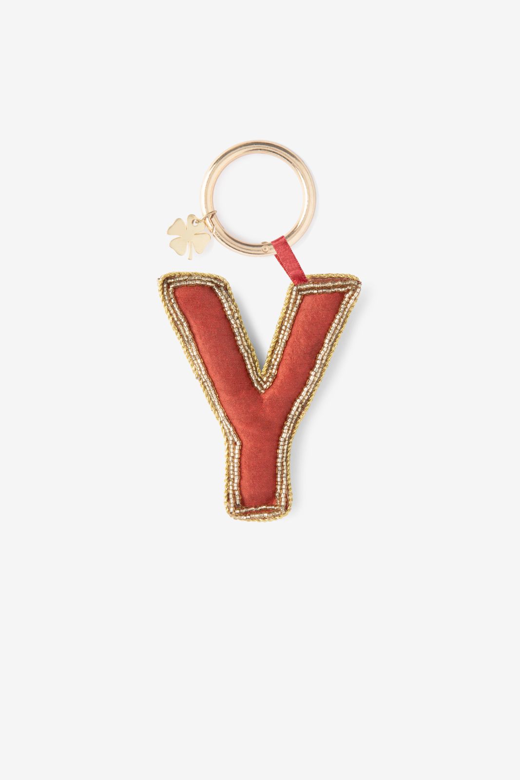Donkerrode bag charm letter Y van Sissy-Boy. De bag charm heeft een all-over kralen design en de vorm van de letter Y. Daarnaast hangt het aan een gouden klipsluiting. Materiaal: 70% Glas, 30% Polyester.