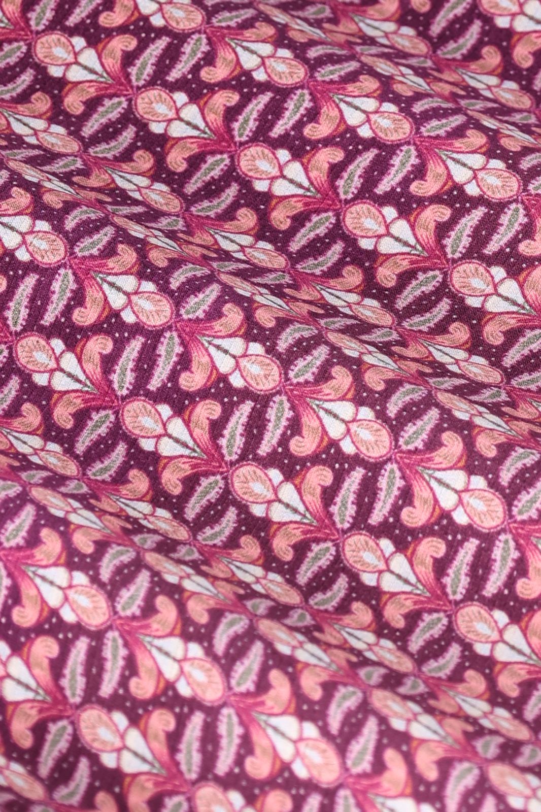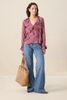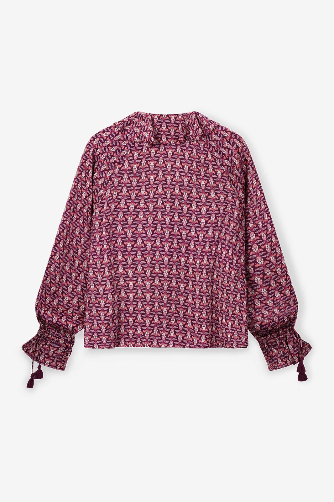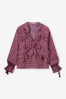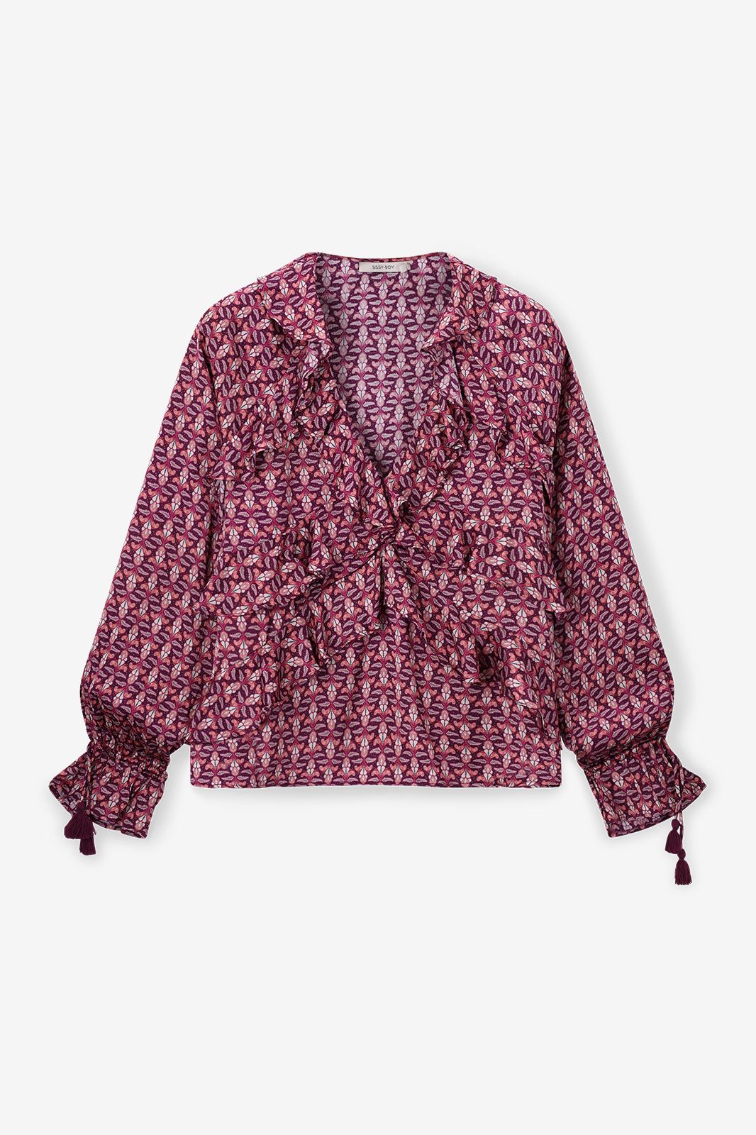 Donkerrode blouse met ruffles van Sissy-Boy. De blouse heeft lange mouwen, een V-halslijn, ruffle details aan de voorzijde en een regular fit. Daarnaast heeft het een donkerrode kleur met een all-over bohemian print. Het model heeft een lengte van 1,74 m en draagt maat S. Materiaal: 100% viscose.