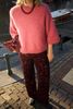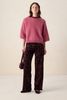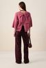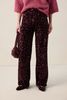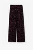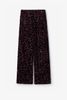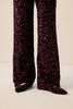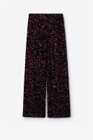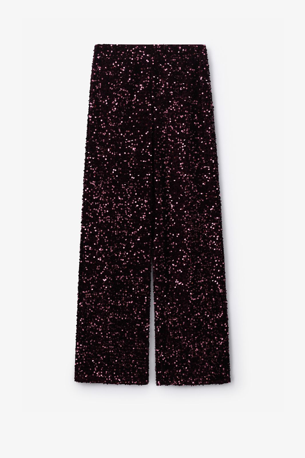 Donkerrode broek met pailletten van Sissy-Boy. De broek heeft een hoge taille, elastische tailleband en uitlopende broekspijpen. Verder is de broek gemaakt met een donkerrode velvet kwaliteit stof en heeft het all-over donkerrode pailletten. Het model heeft een lengte van 1,77 en draagt maat S. Materiaal: 100% polyester.