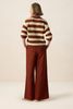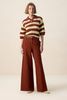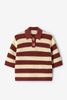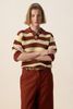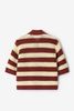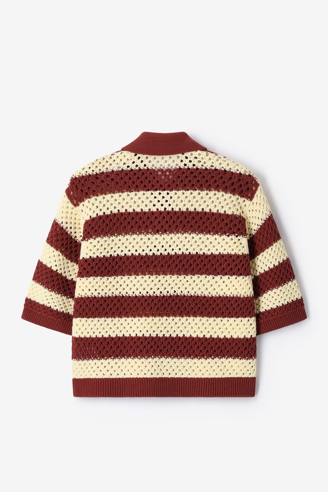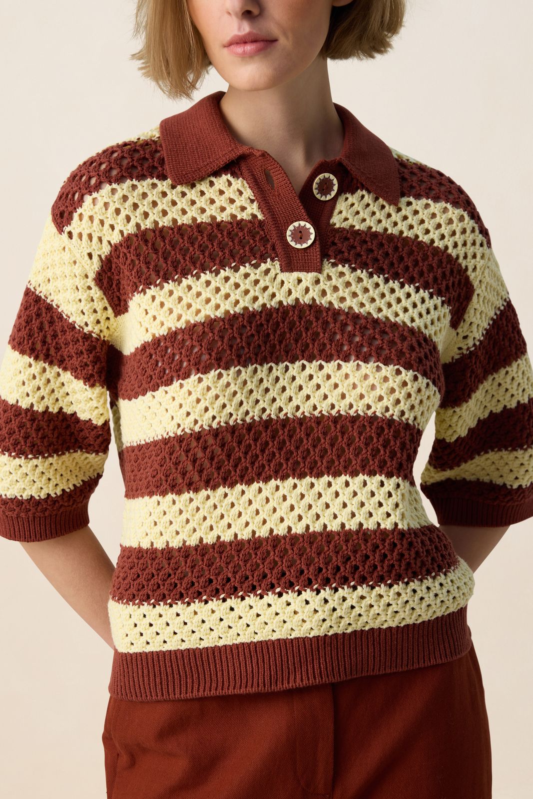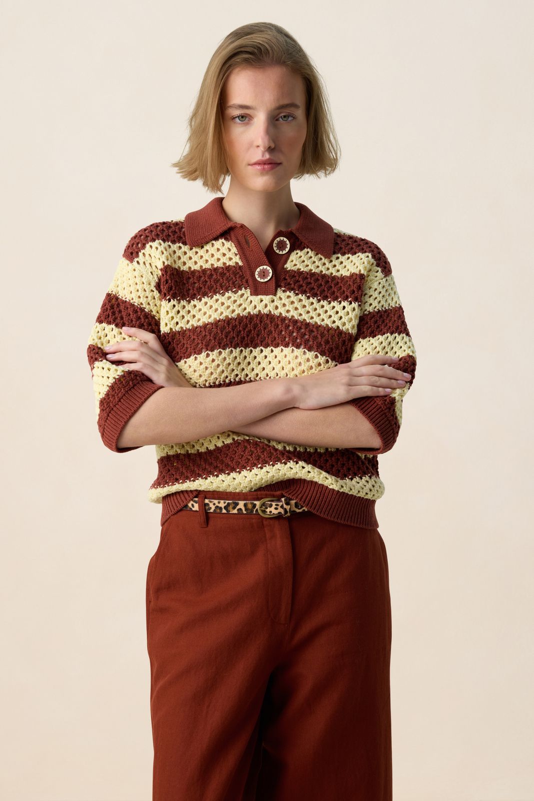 Donkerrode open gebreide polo van Sissy-Boy. De gebreide polo heeft korte mouwen, een polokraag en een knoopsluiting. Verder heeft de polo een donkerrode kleur met een lichtgele strepen design. Materiaal: 60% katoen, 40% acryl.
