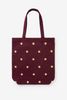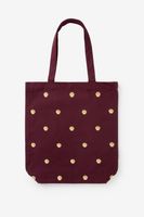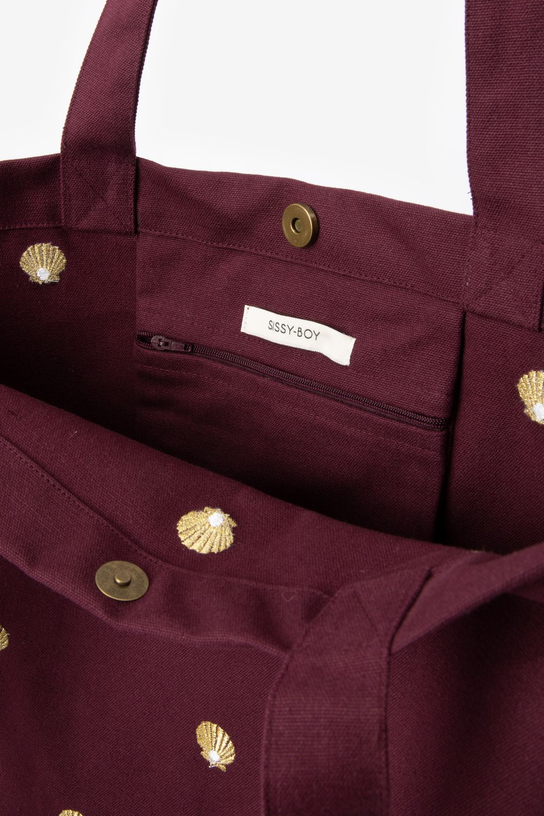 Donkerrode shopper met schelpen van Sissy-Boy. De shopper heeft een donkerrode kleur, een binnenvak met rits en magnetische sluiting. Verder heeft de canvas shopper een all-over gouden schelpen borduursels. Afmetingen: 46,5 cm x 43 cm x 11,5 cm. Afmeting hengsels: 65 cm. Materiaal: 100% katoen.