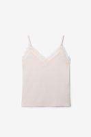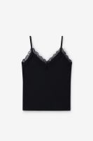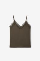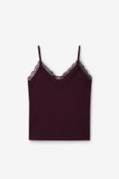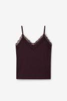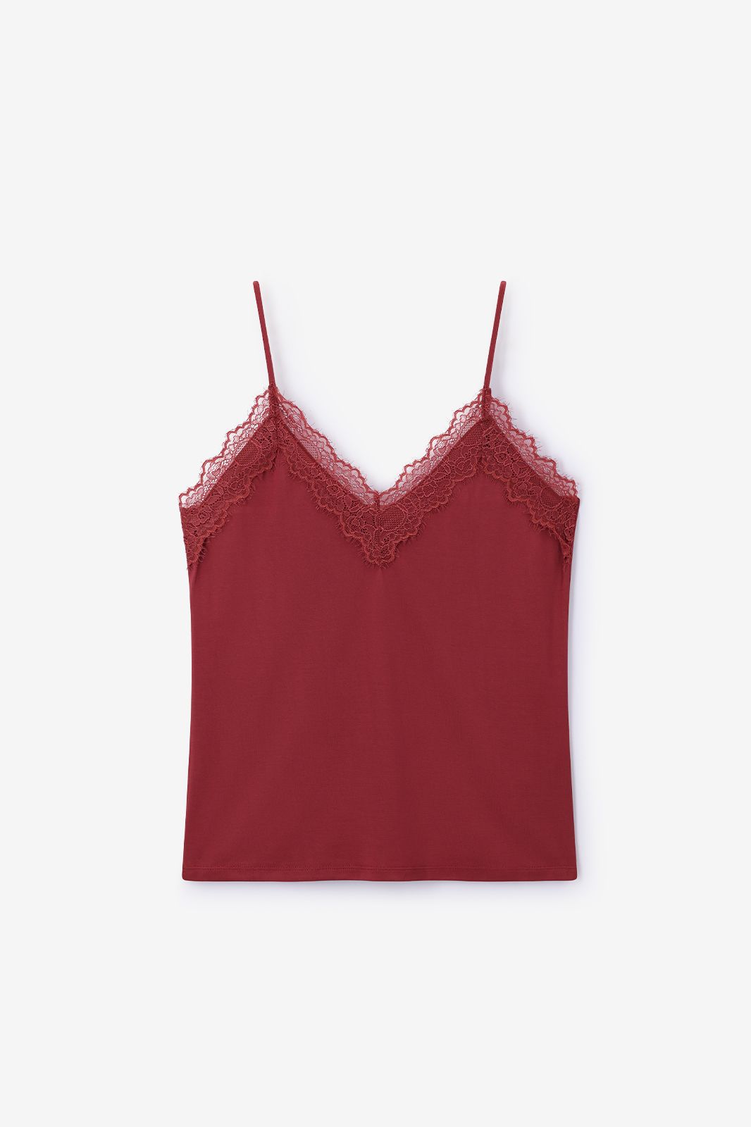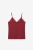 Donkerrood singlet met kant van Sissy-Boy. Het singlet heeft spaghettibandjes en een V-hals, afgewerkt met een kanten rand langs de bovenzijde. Materiaal: 65% modal, 35% polyester.