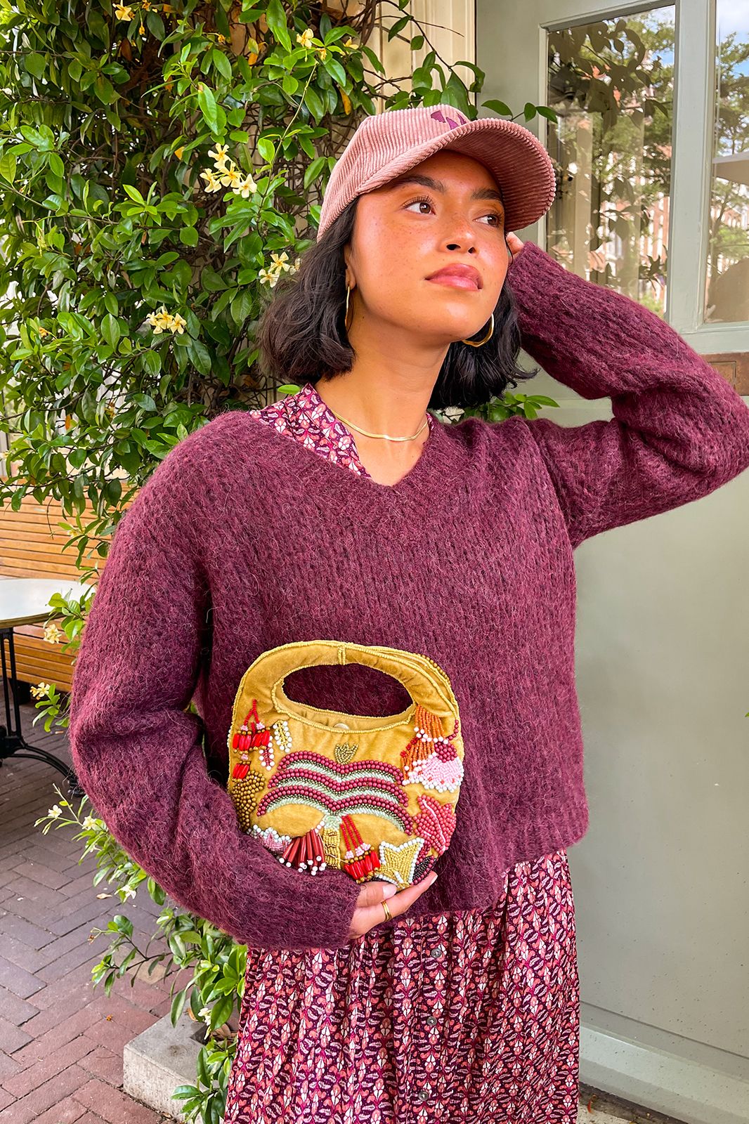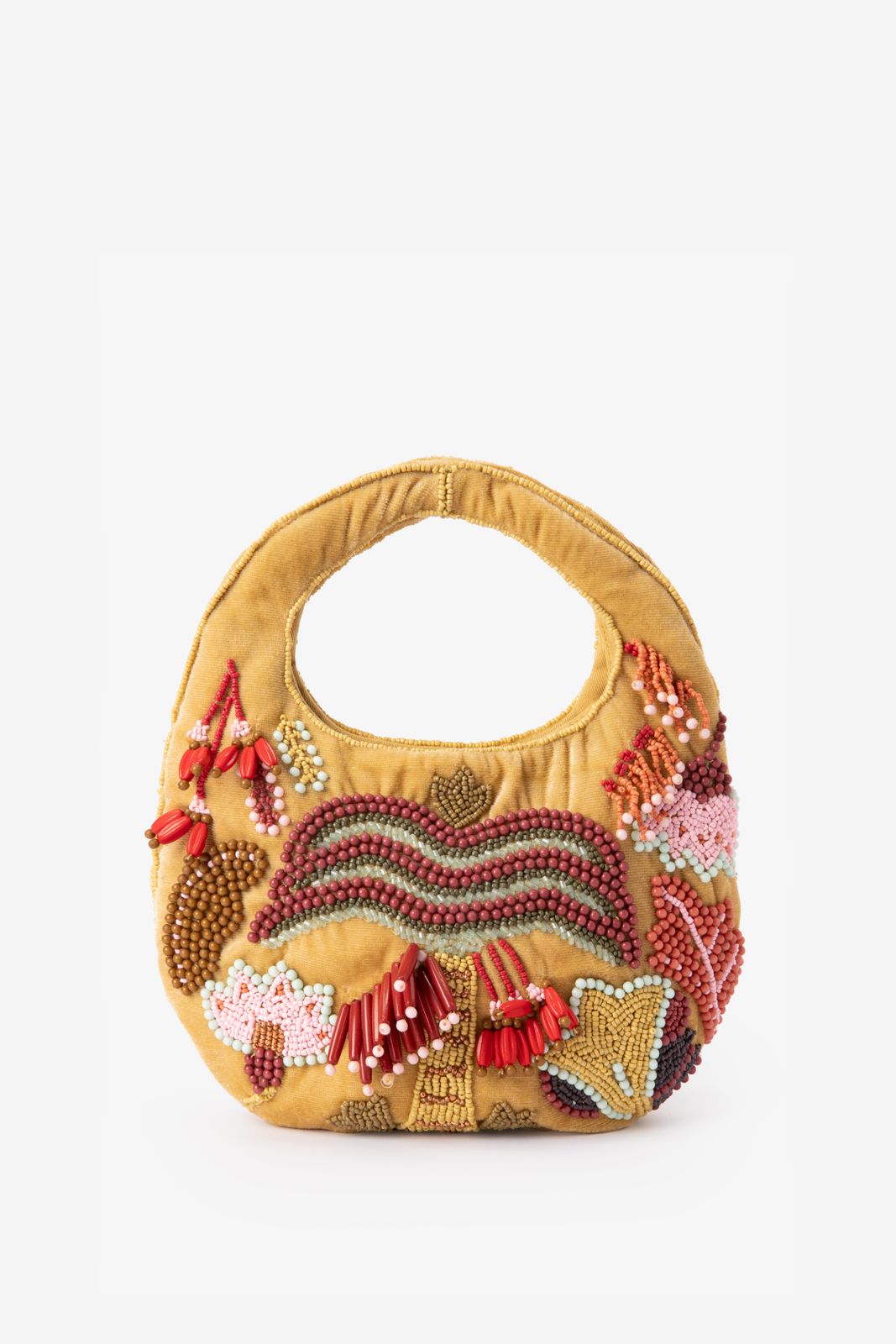 Gele velvet tas met kraaltjes van Sissy-Boy. Het tasje is gemaakt van een gele velvet stof en heeft opgestikte versieringen met kralen. Verder heeft het tasje een magnetische sluiting, een binnenvak en een goudkleurig hengsel. Materiaal: 100% katoen.