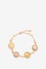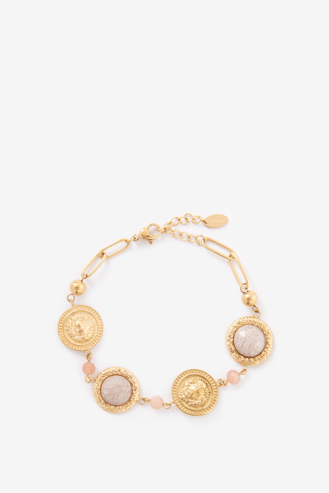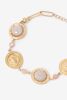 Gold plated armband met stenen van Sissy-Boy. De armband heeft een gouden kleur en bestaat uit muntjes met een steen en leeuw detail. Vermijd contact met cosmetica (parfum, haarlak, make-up, nagellakremover, lichaamsolie, zonnebrandolie, handgel en deodorant). Draag geen sieraden tijdens het douchen, baden of zwemmen. Met name chloor kan de sieraden permanent beschadigen of verkleuren. Afmeting: 16 cm + 3 cm. Materiaal: 100% staal.