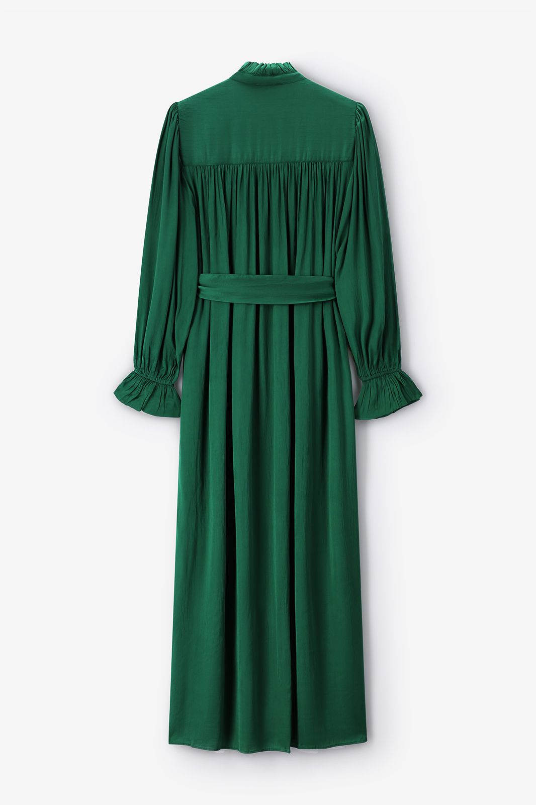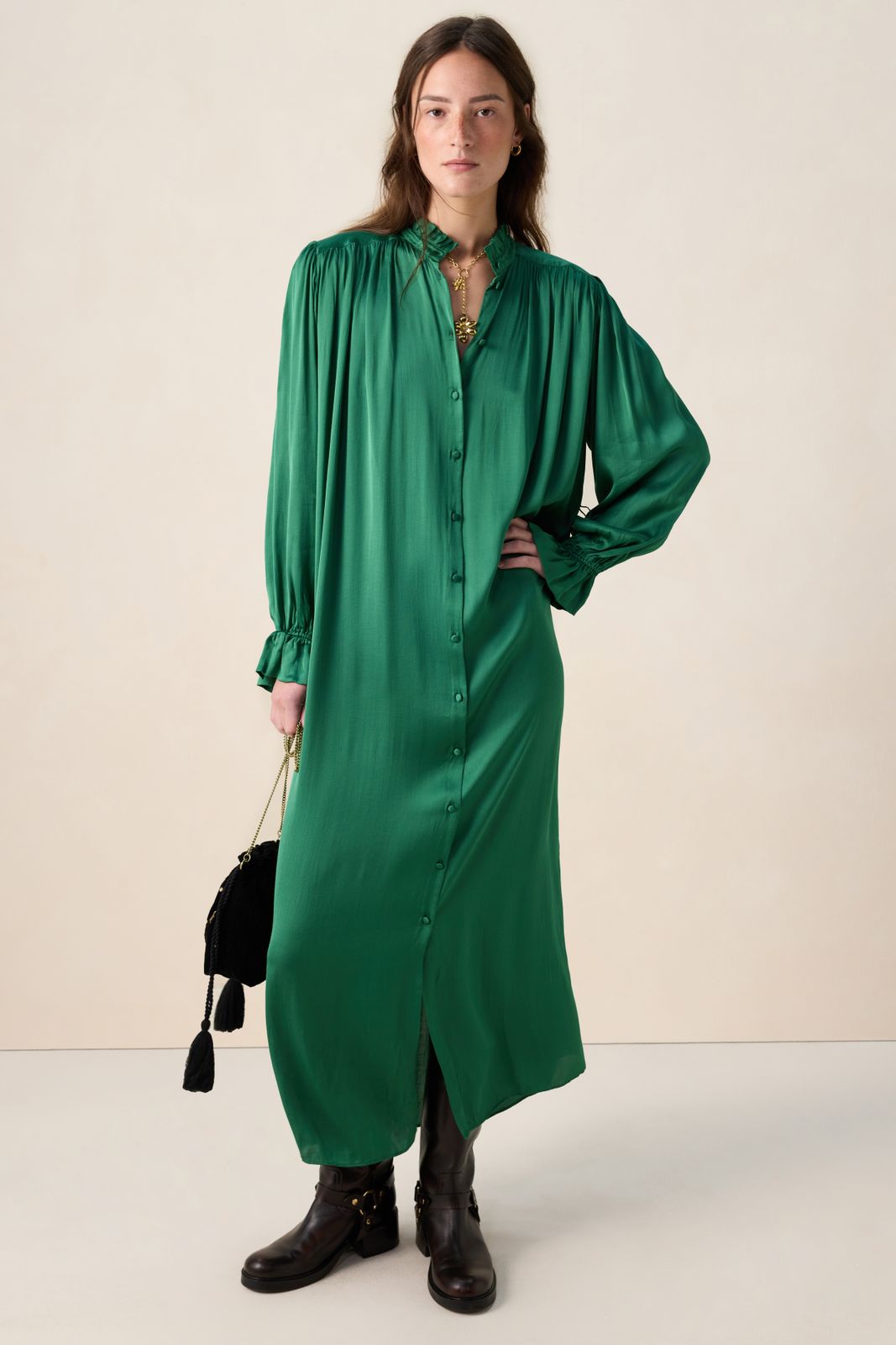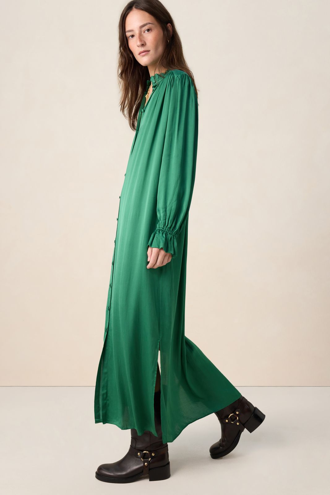 Groene satijnen maxi jurk van Sissy-Boy. De jurk heeft lange pofmouwen, een hoge hals, een knoopsluiting en ruffle details rond de hals en mouwen. Verder heeft de jurk een maxi-lengte, een ceintuur in de taille en is het gemaakt van een groene satijnen look stof. Het model heeft een lengte van 1,77 en draagt maat S. Materiaal: 100% viscose.
