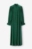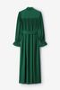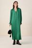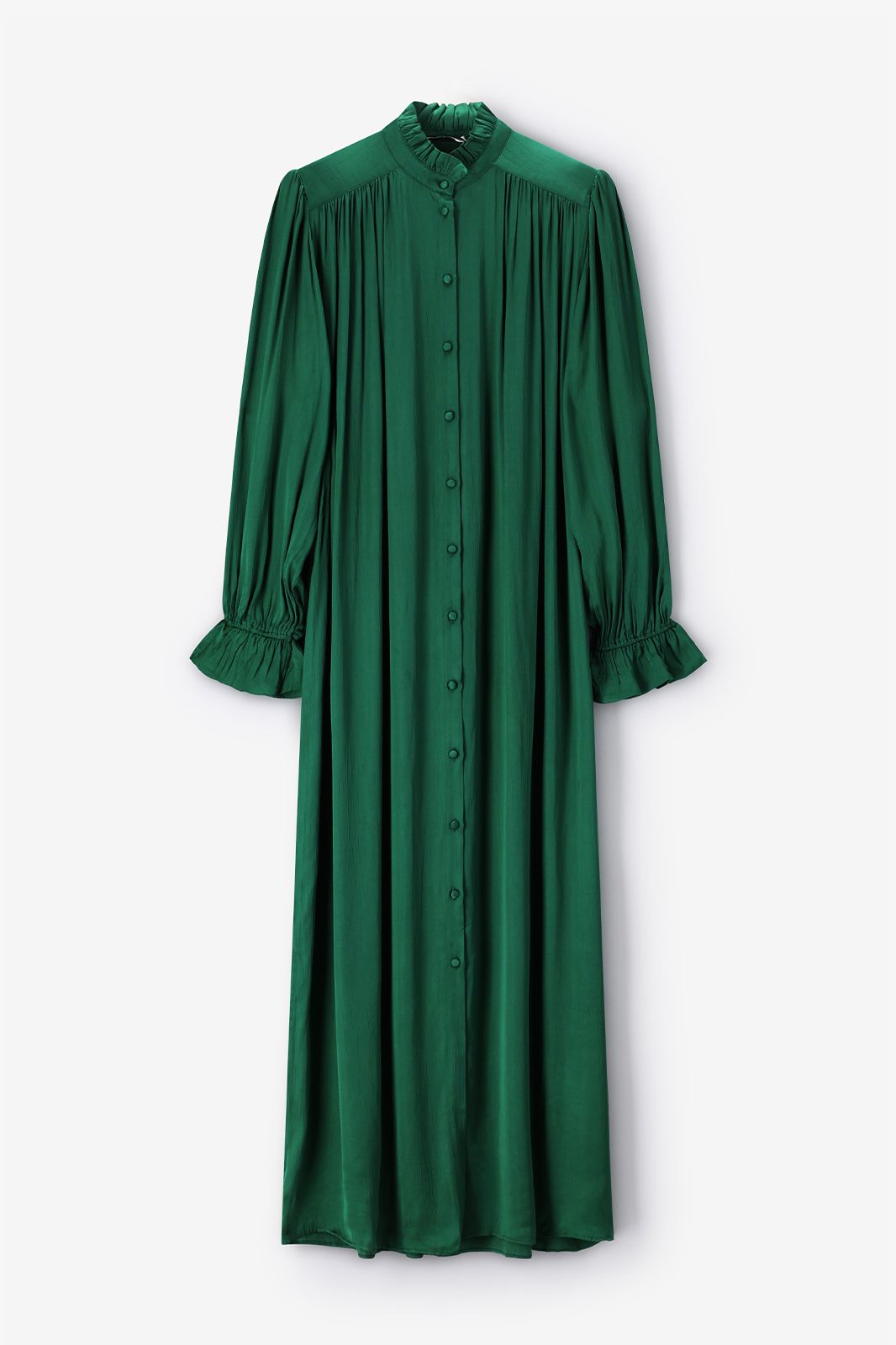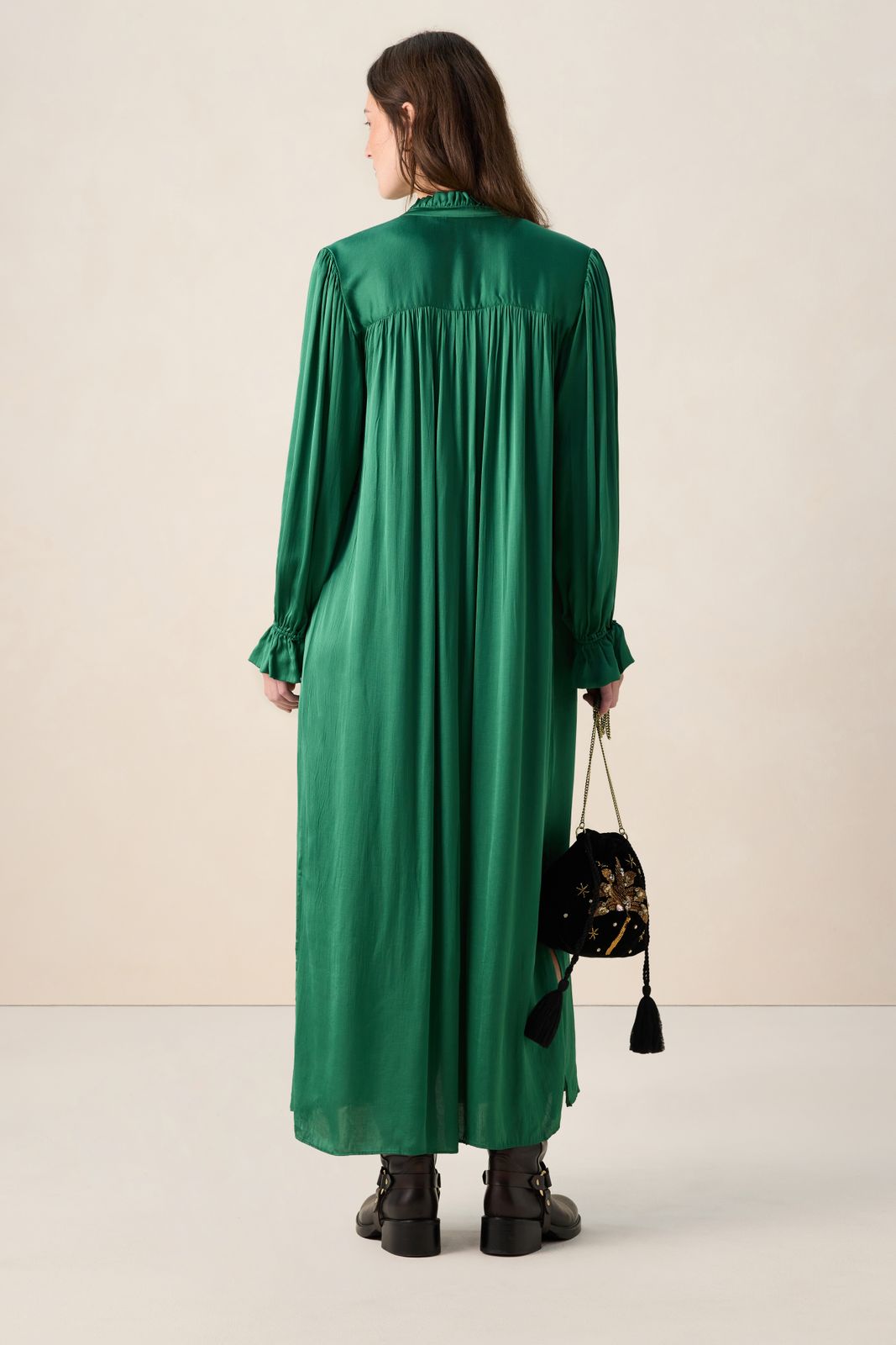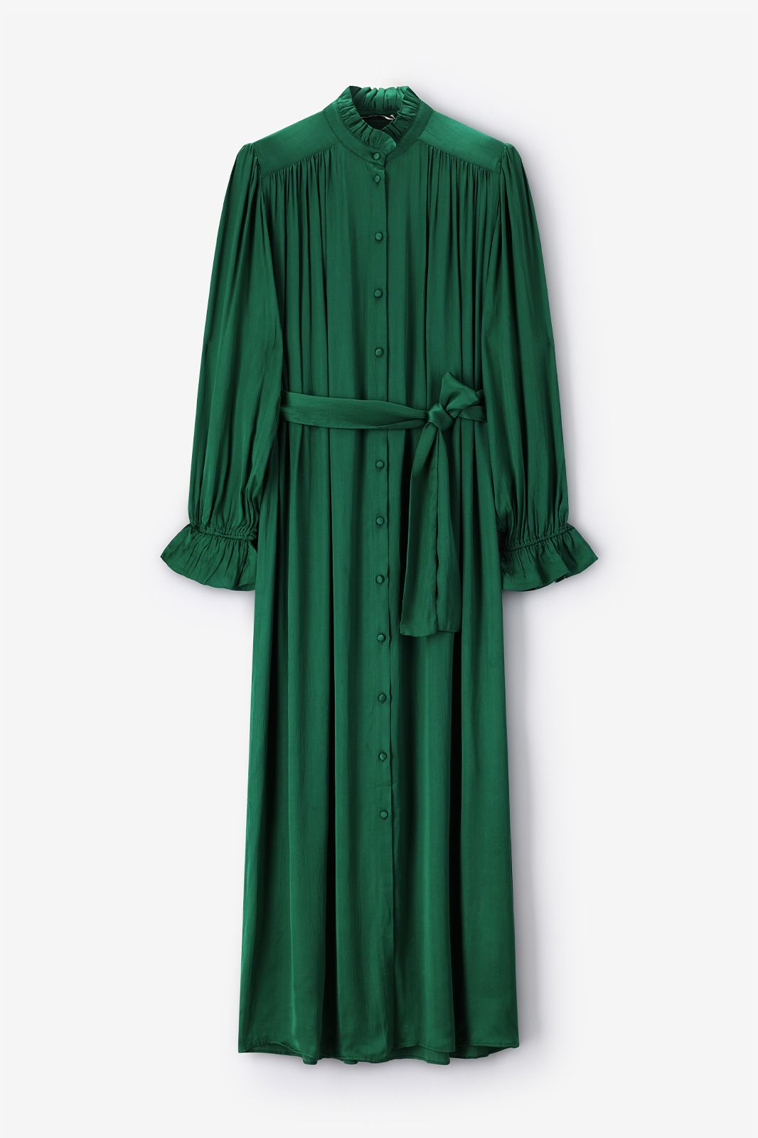Groene satijnen maxi jurk van Sissy-Boy. De jurk heeft lange pofmouwen, een hoge hals, een knoopsluiting en ruffle details rond de hals en mouwen. Verder heeft de jurk een maxi-lengte, een ceintuur in de taille en is het gemaakt van een groene satijnen look stof. Het model heeft een lengte van 1,77 en draagt maat S. Materiaal: 100% viscose.