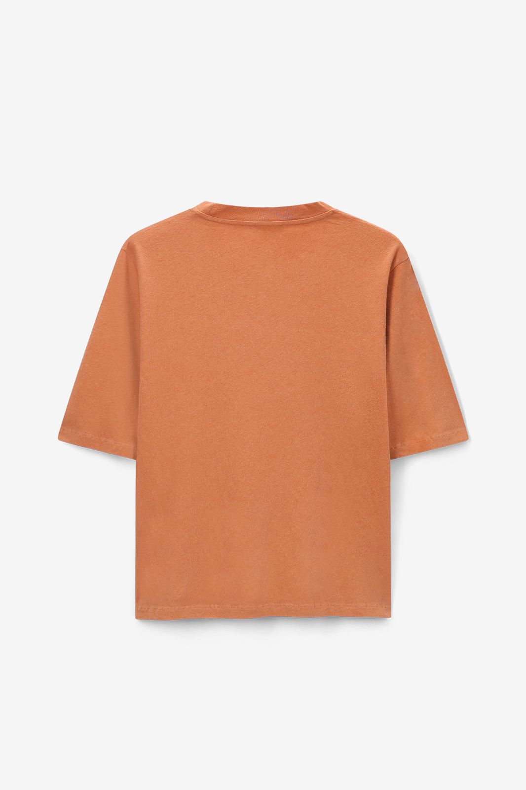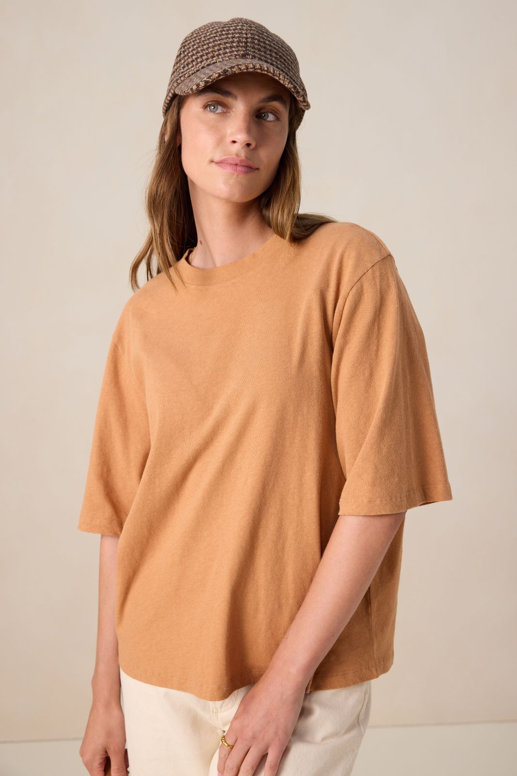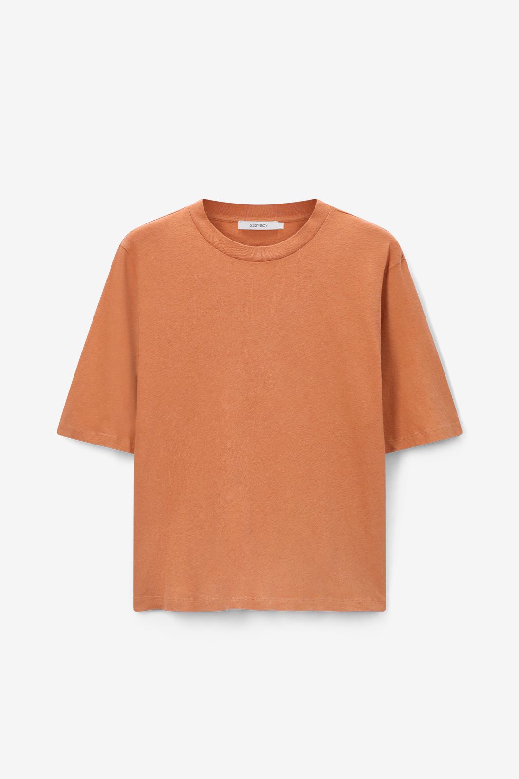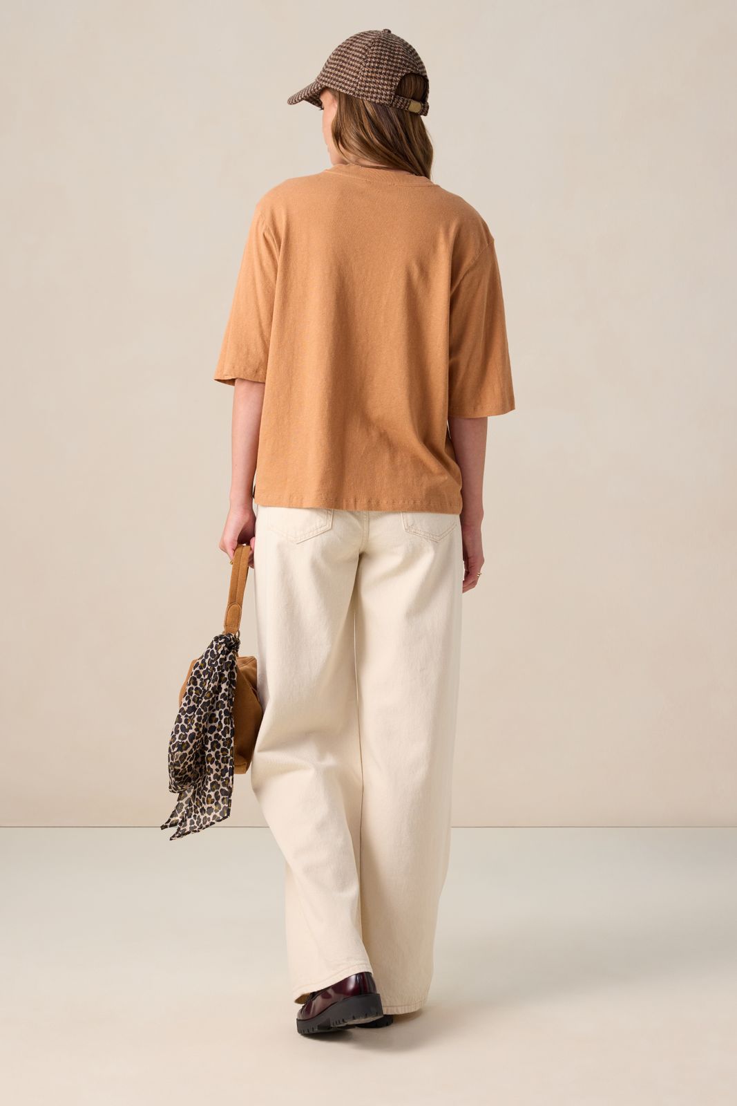 Lichtbruin linnenmix T-shirt van Sissy-Boy. Het T-shirt heeft korte mouwen, een ronde halslijn en een relaxed fit. Het model heeft een lengte van 1,72 m en draagt maat S. Materiaal: 70% katoen, 30% linnen.