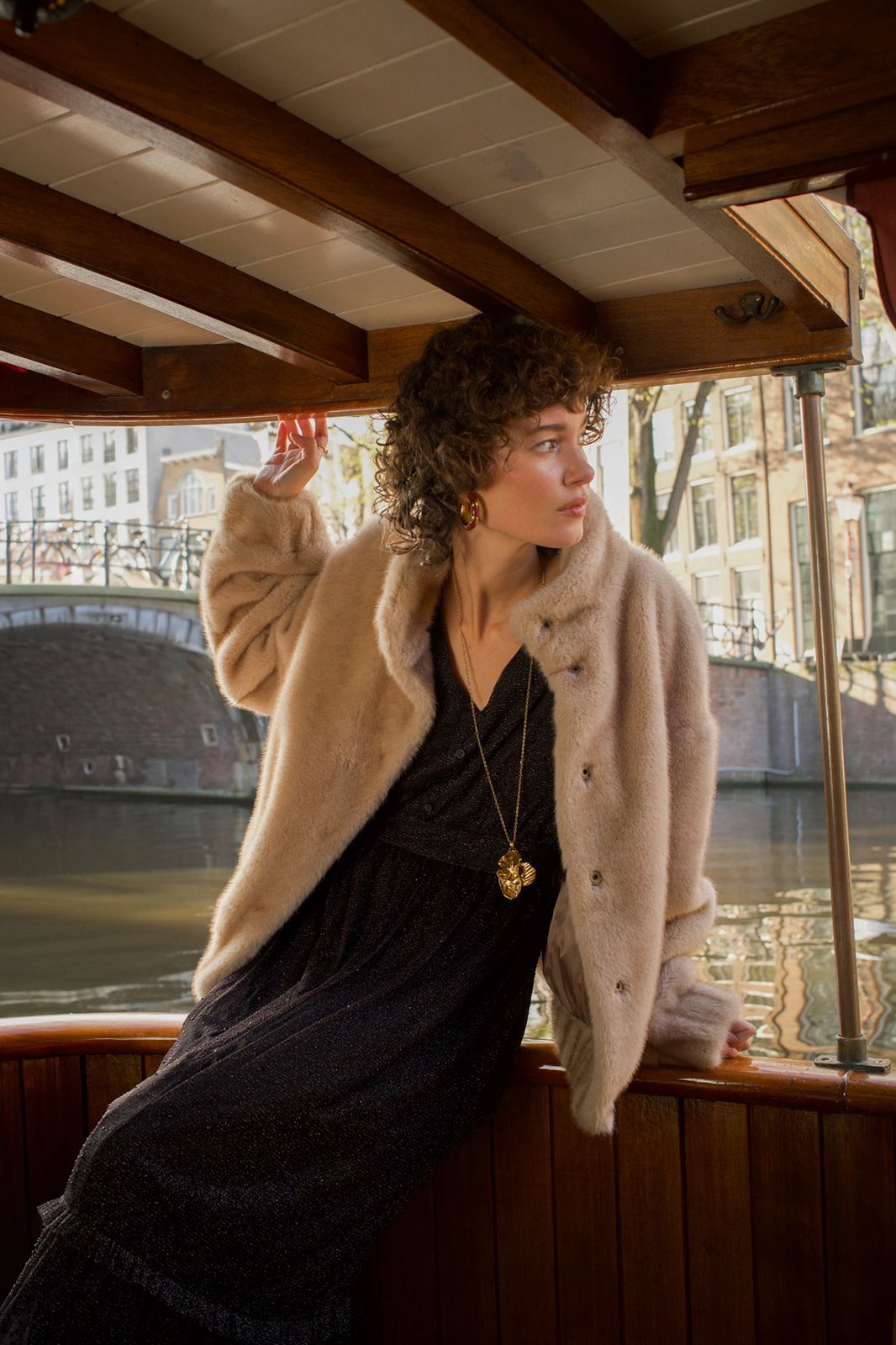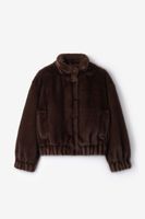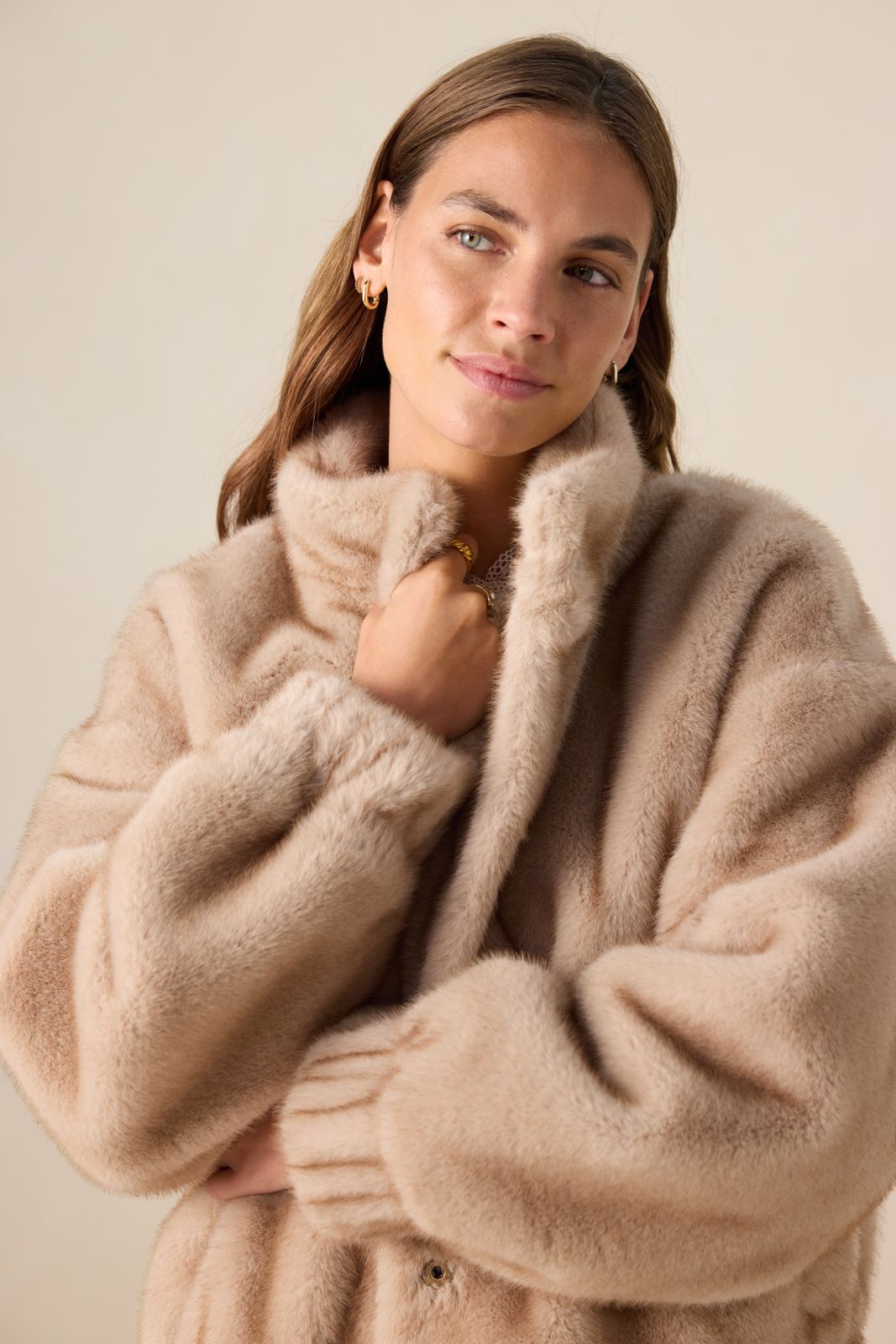 Lichtbruine faux fur jas van Sissy-Boy. De jas heeft lange mouwen met verlaagde schouders en een korte boxy fit. Door het elastiek aan de onderzijde krijgt de jas een cropped look. Daarnaast heeft het een hoge hals, een knoopsluiting, een binnenvoering, steekzakken en is het gemaakt van imitatiebont. Het model heeft een lengte van 1,72 m en draagt maat S. Materiaal: 100% polyester.
