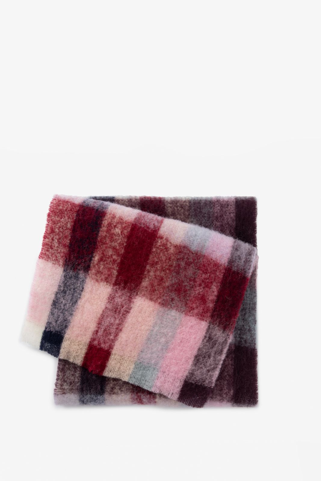 Multicolor geruite sjaal van Sissy-Boy. De sjaal heeft een multicolor all-over ruit patroon. Het patroon heeft een lichtroze, rode en blauwe kleur. Afmeting: 200x 35cm. Materiaal: 90% Wol, 10% Polyamide.