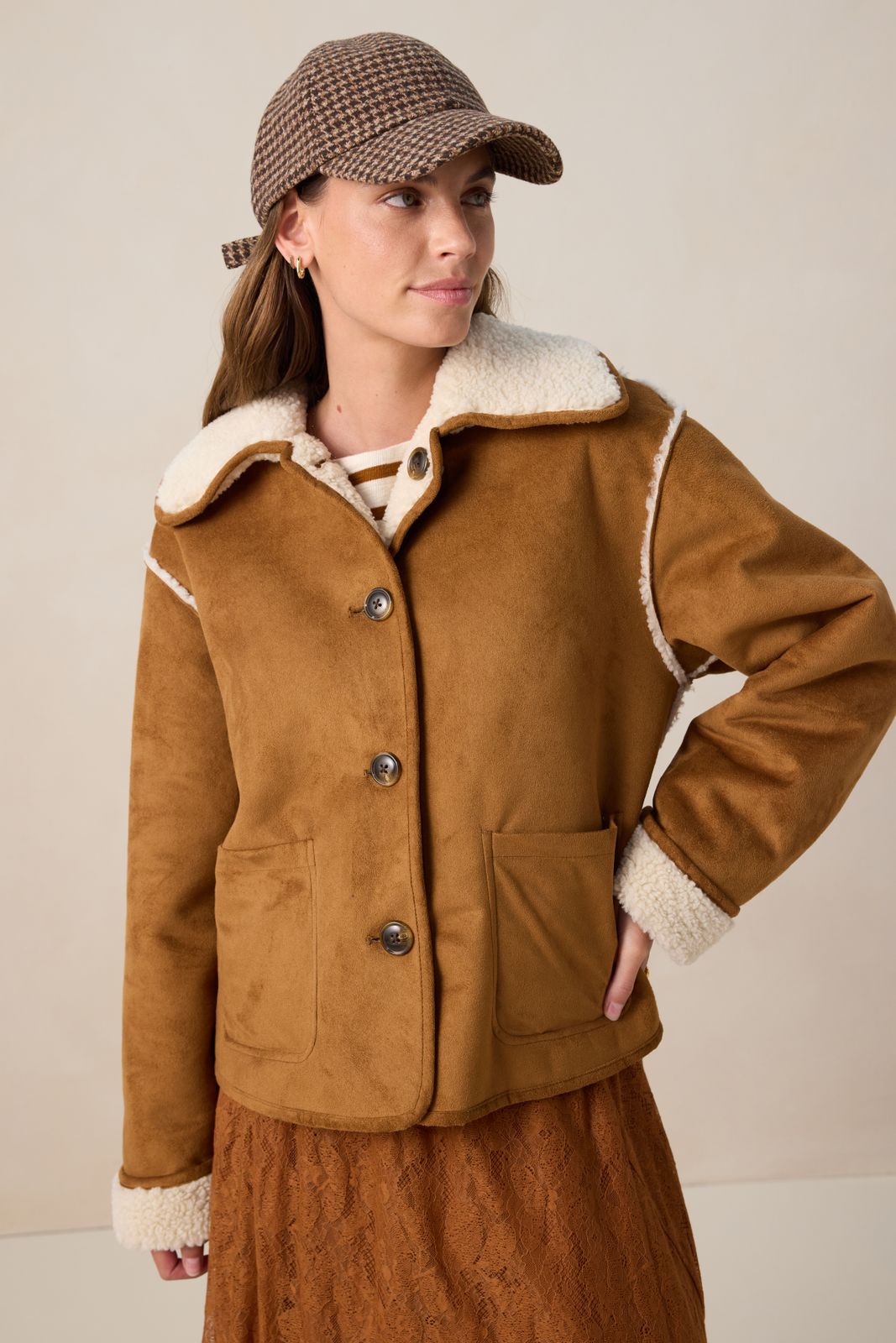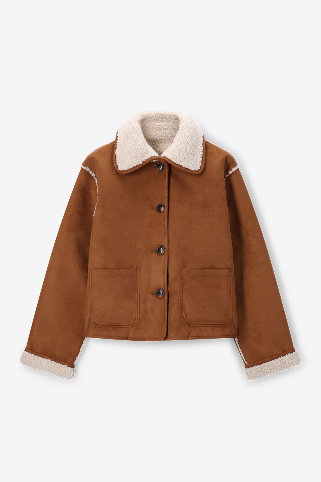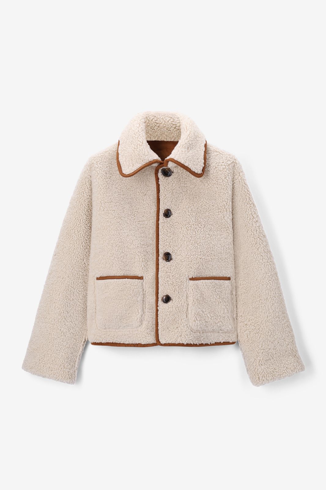 Witte faux lammy reversible jas van Sissy-Boy. De jas heeft lange mouwen met verlaagde schouders en een korte boxy fit. Verder heeft het een hoge hals, een kraag, opgestikte zakken en een knoopsluiting. De jas is reversible, waardoor je het aan twee kanten kan dragen. Het model heeft een lengte van 1,72 m en draagt maat S. Materiaal: 100% polyester.
