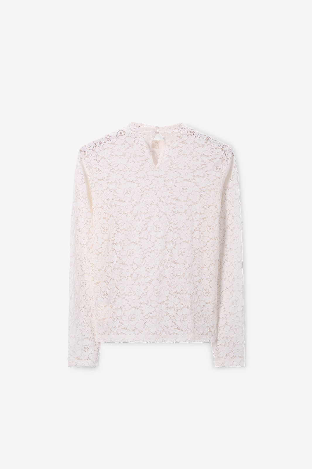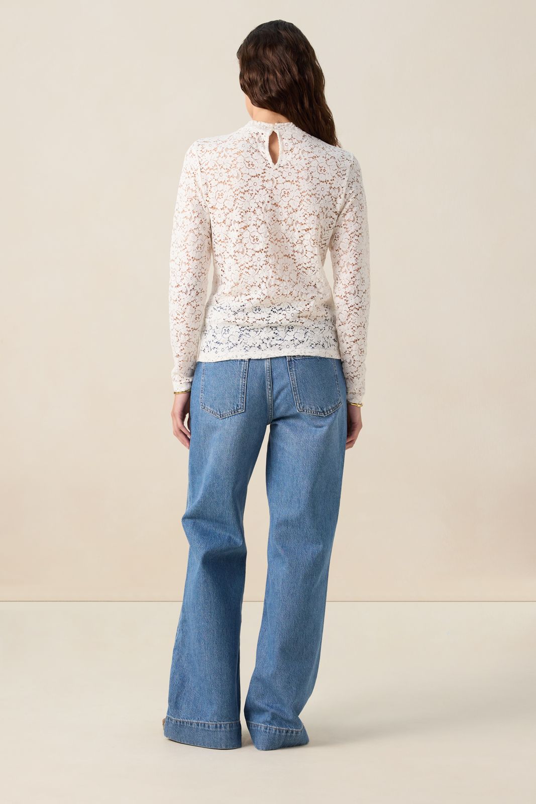 Witte kanten top van Sissy-Boy. De top heeft lange mouwen, een turtle neck, een knoopsluiting in de nek en een regular fit. Verder heeft het een witte kleur met een all-over kanten design. Materiaal: 89% polyamide, 11% elastaan.