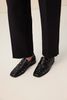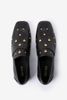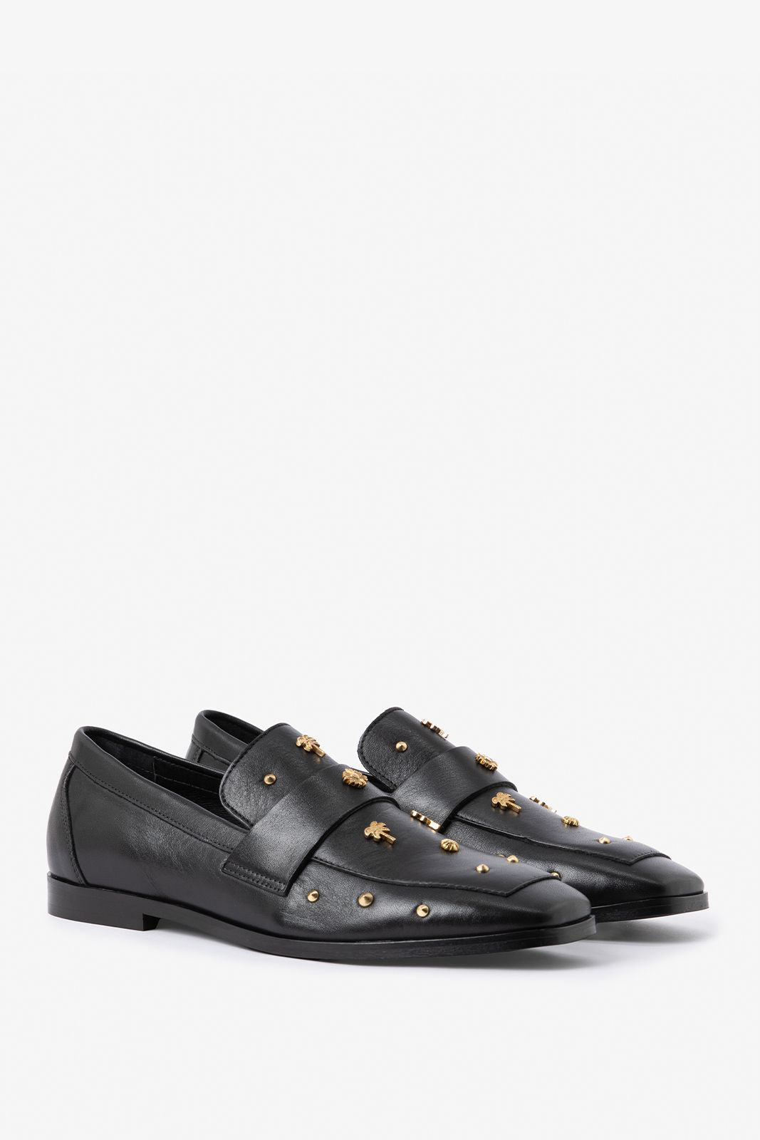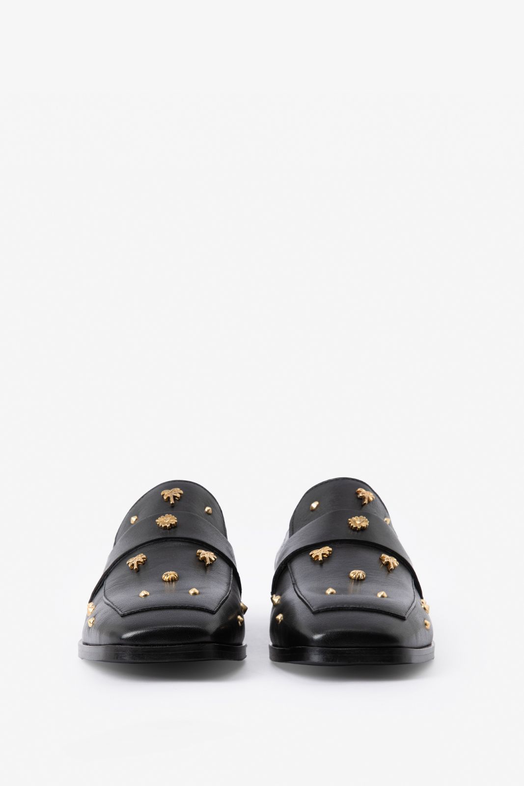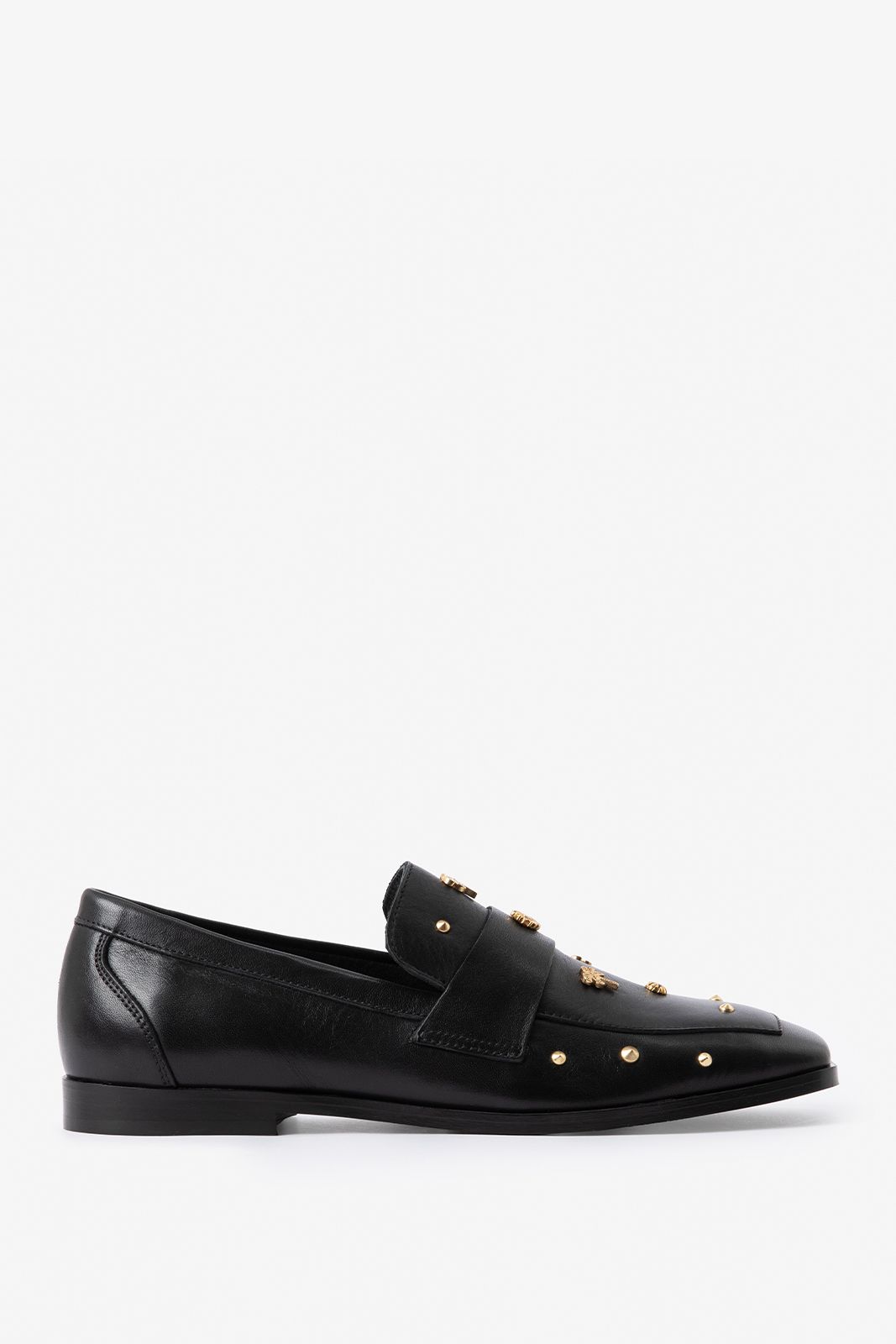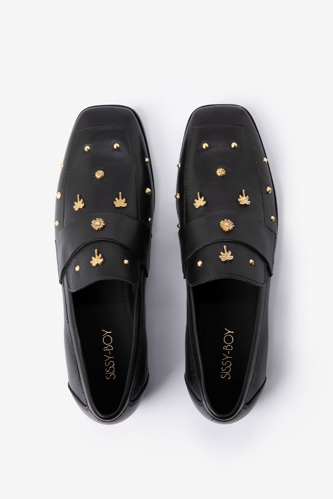 Zwarte leren loafer met studs van Sissy-Boy. De loafers hebben een vierkante neus, leren binnen-en buiten kant, lage hak van 1 cm en aan de voorzijde gouden palmboom studs. Materiaal: 100% leer.
