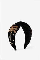 Zwarte velvet haarband met palmboom van Sissy-Boy. De haarband heeft een knoop detail en is gemaakt van een velvet kwaliteit stof. Verder heeft de haarband een zwarte kleur en een opgestikte palmboom aan de zijkant. Materiaal: 100% polyester.