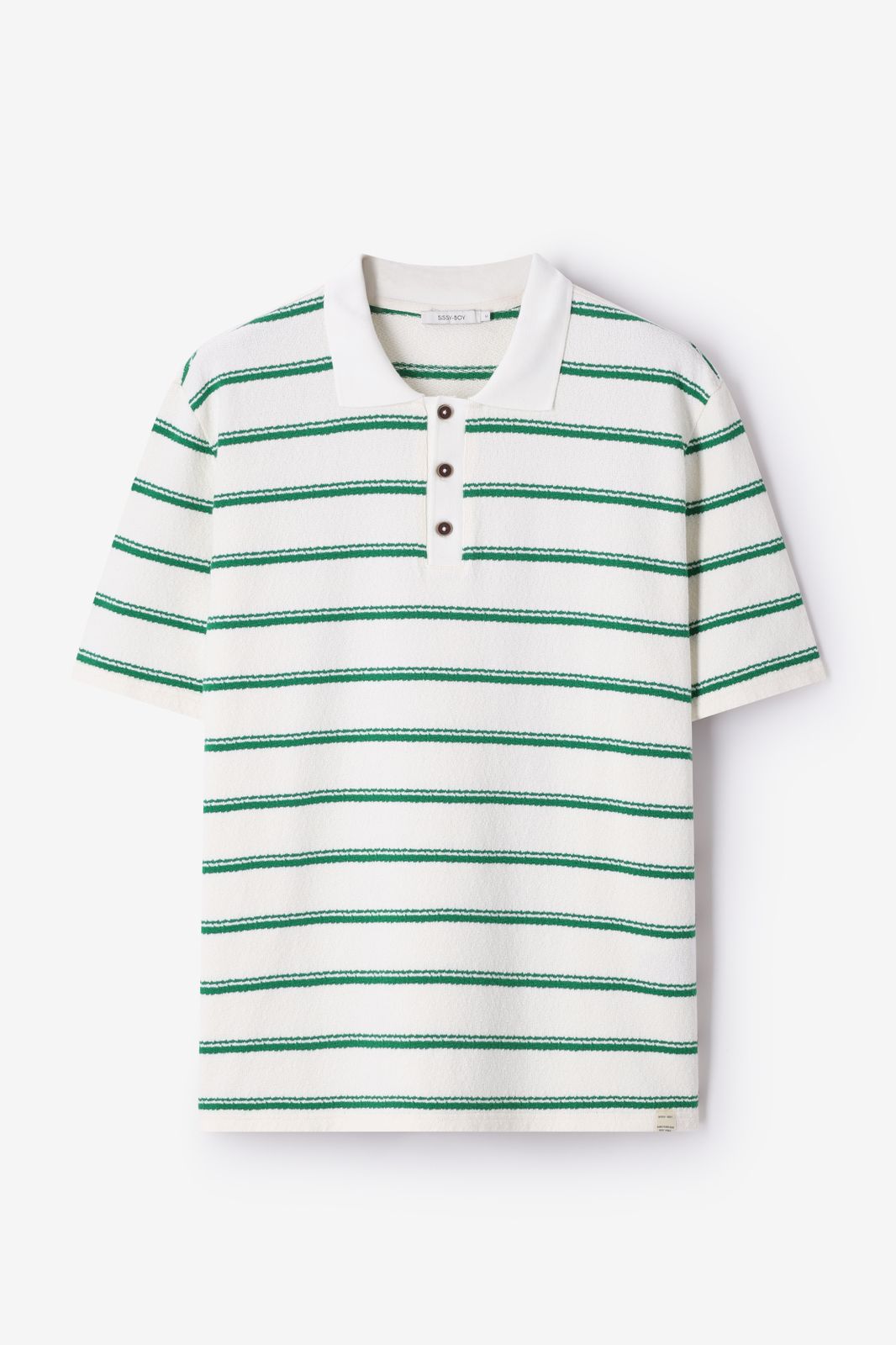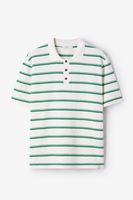 Donkergroene polo met strepen van Sissy-Boy. Het T-shirt heeft korte mouwen, een polokraag en een knoopsluiting aan de voorzijde. Verder heeft de polo een witte en donkergroene strepen design. Materiaal: 100% katoen.