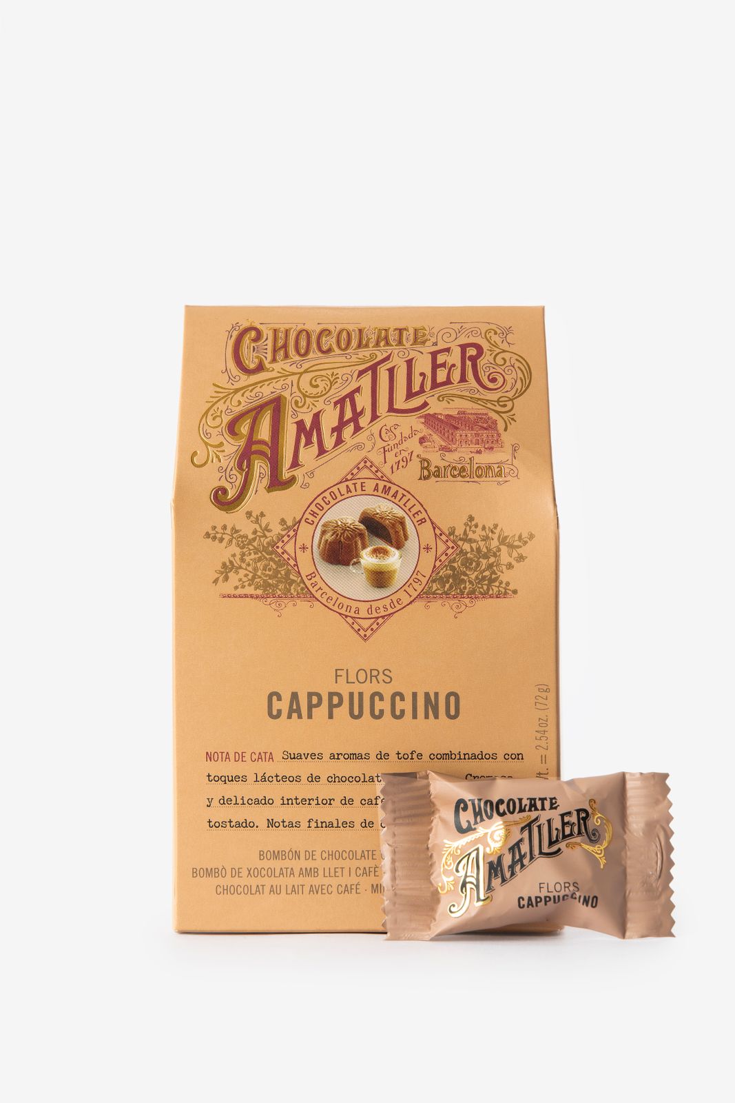 Chocolate Amatller bonbons van melk chocolade met een cappuccino vulling. Ingrediënten:suiker, cacaoboter, volle melkpoeder (18%), verse room (9%), cacaomassa (4%), vloeibare glucose, geroosterde gemalen koffie (3%), emulgator (sojalecithine), natuurlijke aroma’s. LET OP: kan sporen van noten bevatten. Inhoud: 72 gr.