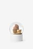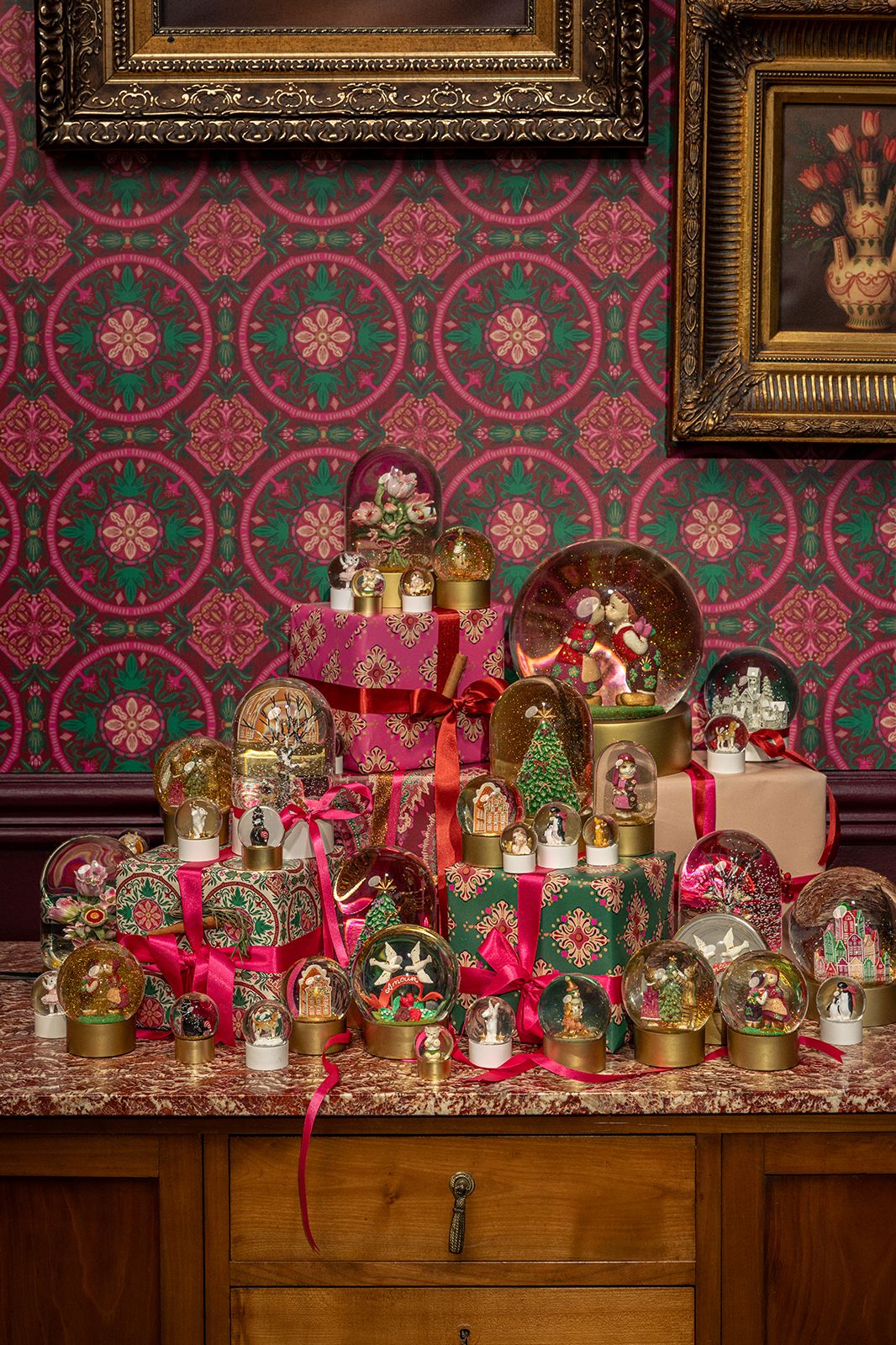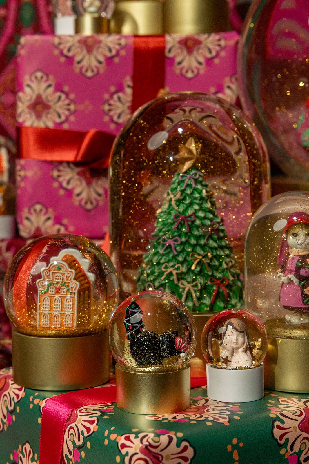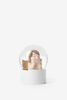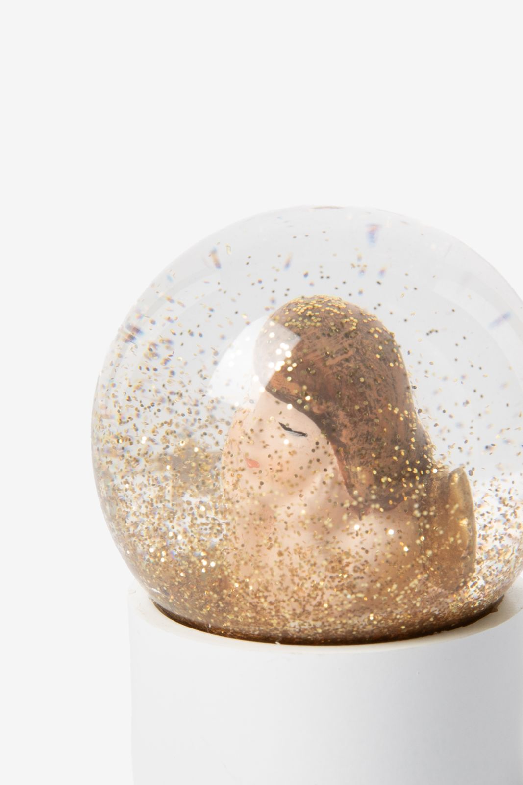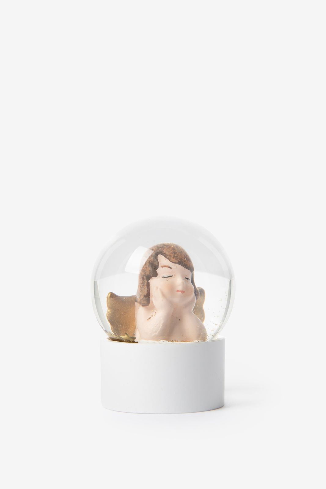 Glazen sneeuwbol met engel van Sissy-Boy. De sneeuwbol heeft een wit opzetstuk en aan de binnenzijde een klein engeltje. Wanneer de bol wordt geschud vliegen er gouden glitters door de bol heen. Afmetingen: 3,5 cm. Materiaal: 50% water, 40% resin, 10% glas.