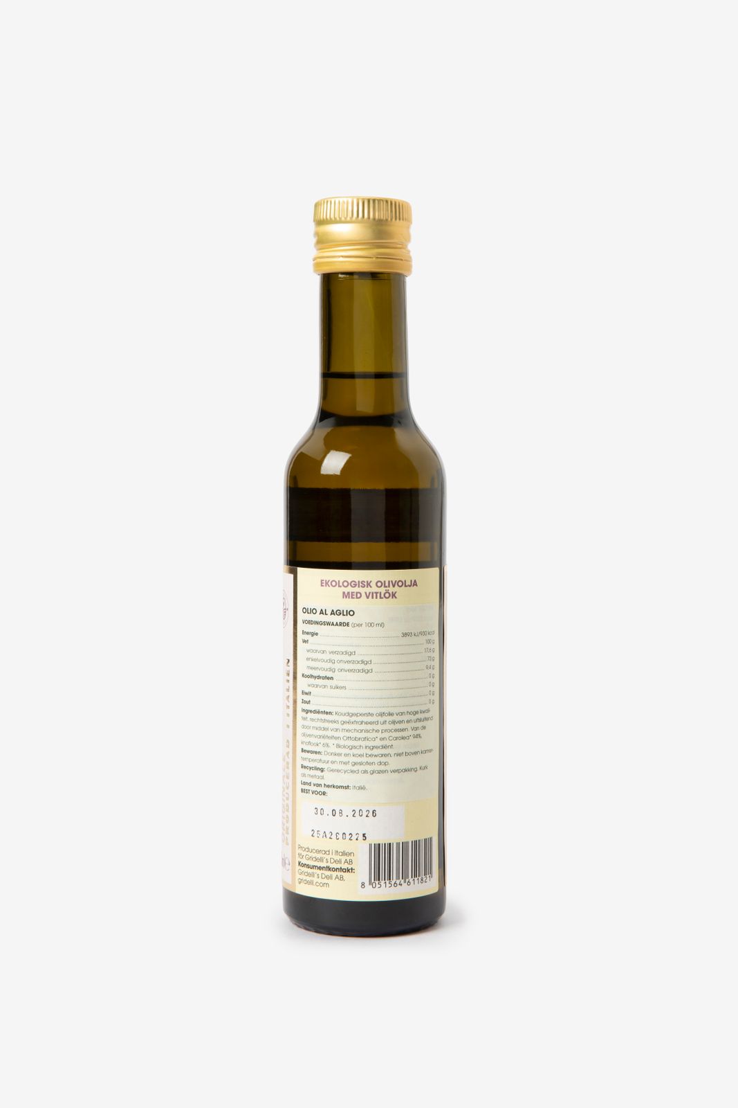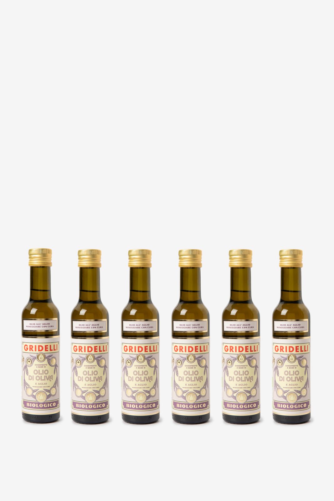 Olio al aglio van Gridelli. Een biologische olijfolie met knoflook uit het zonnige Calabrië. De olijfolie is extra vierge en gemaakt van de olijfsoorten Ottobratica en Carolea. Ingrediënten: 94% biologische olijfolie en 6% biologische knoflook geeft het gerechten extra karakter zonder te overheersen. Inhoud: 250 ml. Let op: deze olie wordt per 6 flesjes verzonden. Liever één flesje? Kom dan langs in een van onze winkels!