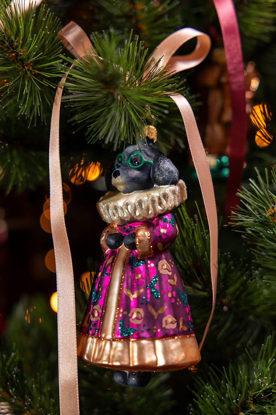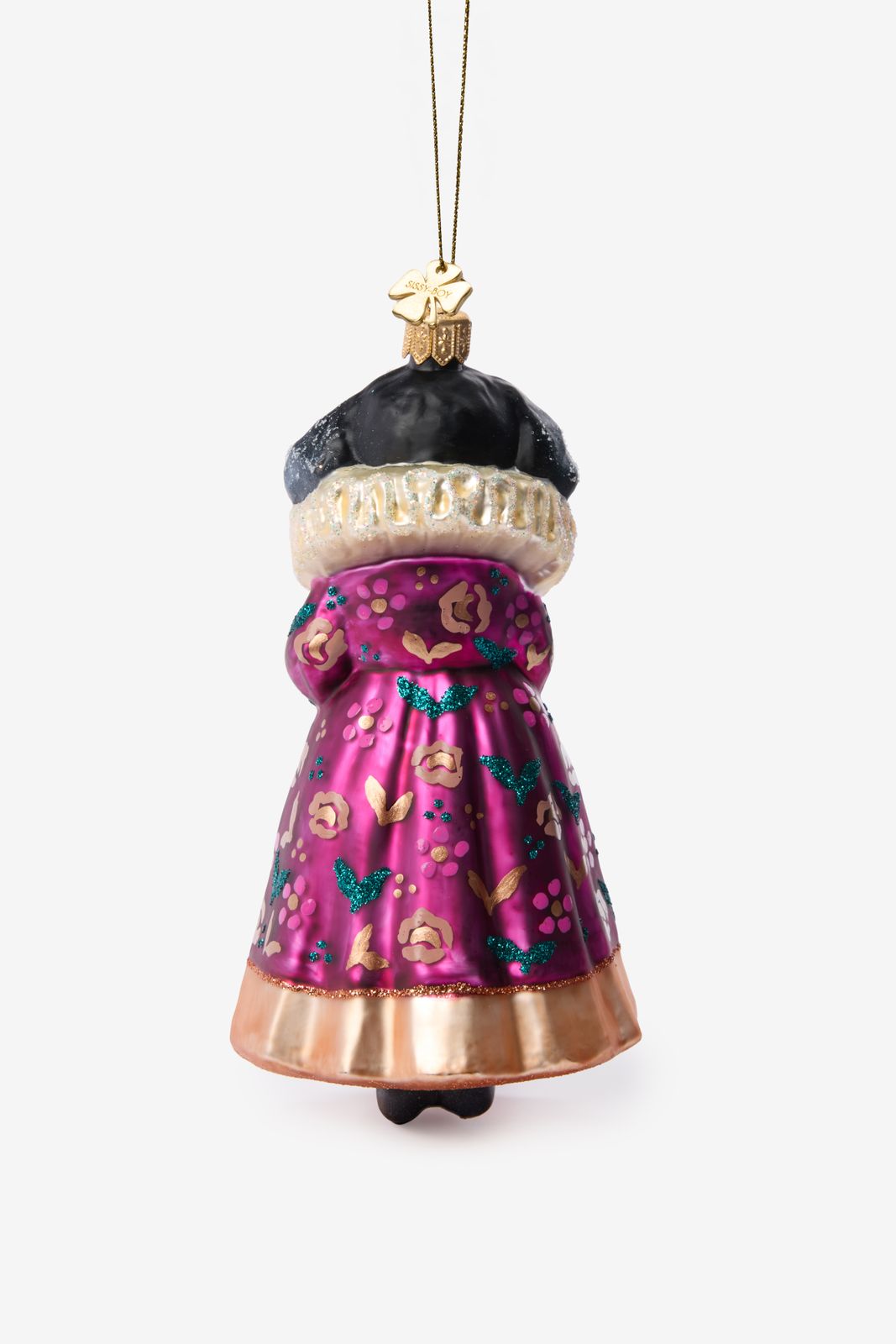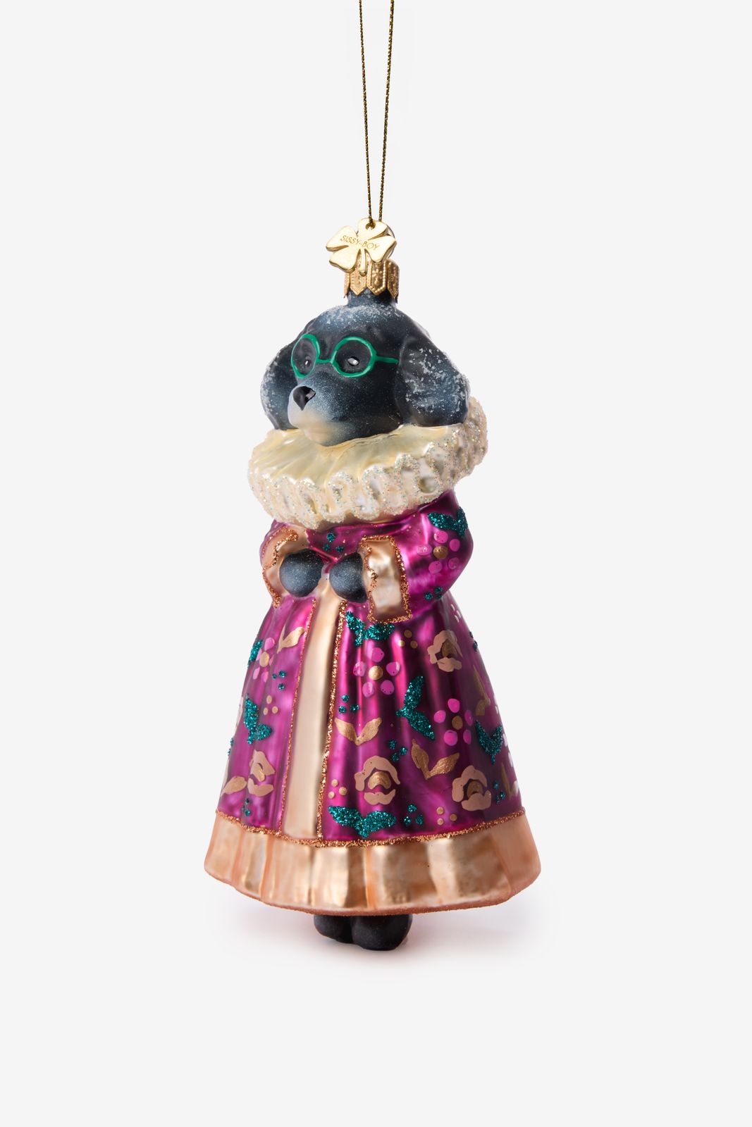 Kerstornament van een poedel met jurk van Sissy-Boy. De poedel is aangekleed met een roze jurk met bloemen en gouden details. Afmeting: 14 cm. Materiaal: 100% glas.