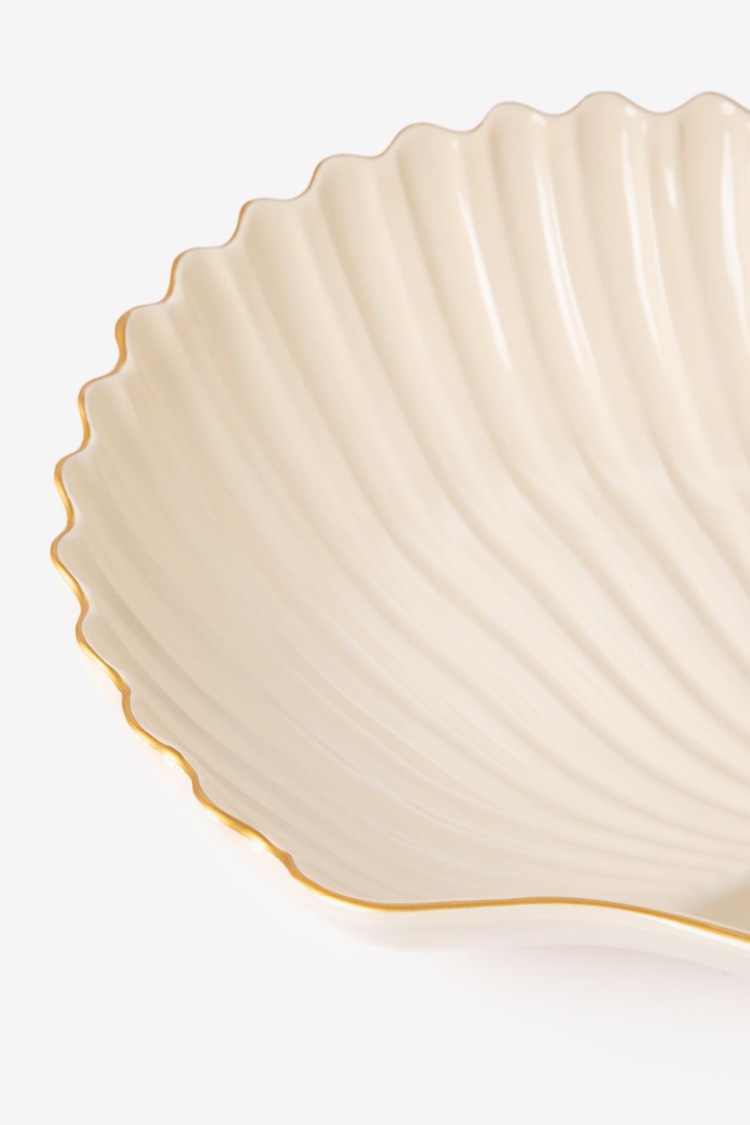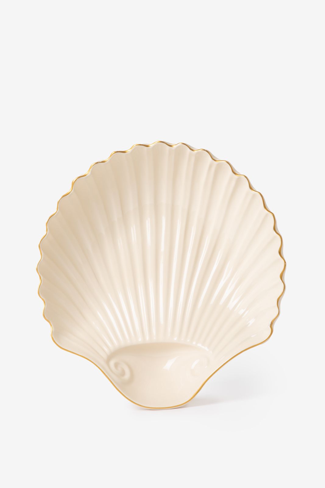 Lichtgele schelpenschaal van Sissy-Boy. De schaal heeft een lichtgele kleur en de vorm van een schelp. Verder heeft de schaal ruffle details en een goudkleurige rand. Afmetingen: 39 cm x 35,5 cm. Materiaal: 100% keramiek.