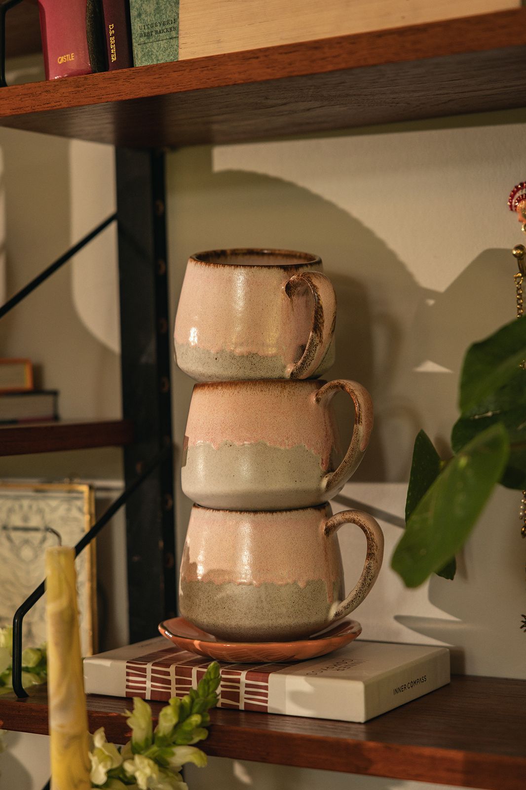 Set van 6 mokken met oor in de kleuren lichtroze, groen en bruin. De mokken zijn vaatwasser bestendig, hebben een dia van 9,5 cm en een hoogte van 10 cm. Let op: online kan je dit artikel alleen in een set kopen. Wil je liever 1 stuk? Ga dan langs in één van onze winkels.