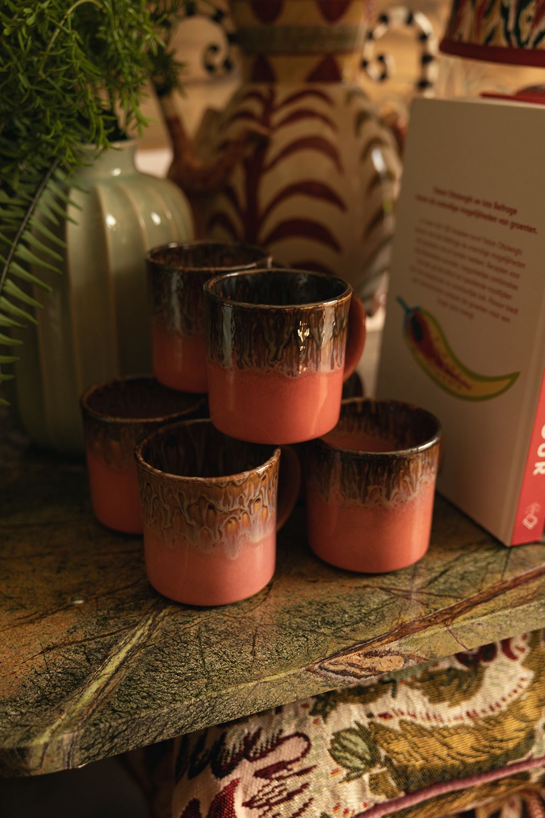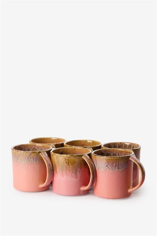 Set van 6 geglazuurde mokken van Sissy-Boy. De mokken zijn gemaakt van keramiek en hebben een roze kleur met bruine en blauwe details. De mokken hebben een afmeting van 9 x 8,5 cm. Let op: online kan je dit artikel alleen in een set van 6 kopen. Wil je liever 1 stuk? Ga dan langs in één van onze winkels. Materiaal: 100% keramiek.