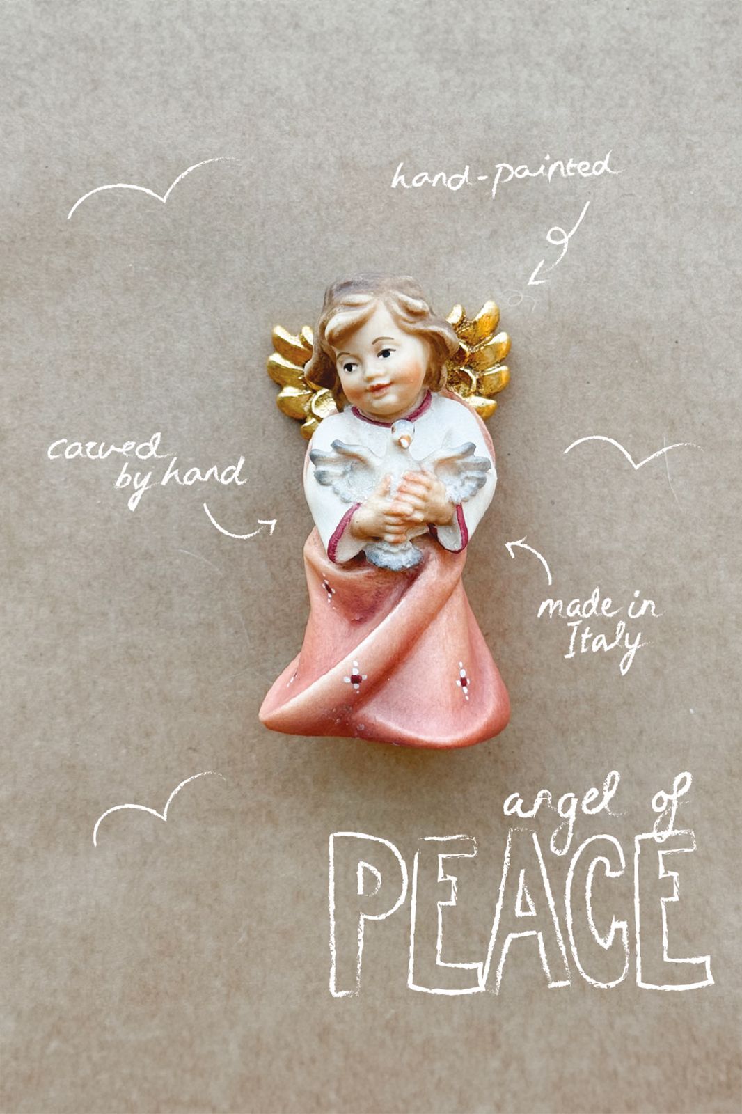 Roze houten kerstengel van Sissy-Boy. De kerstengel heeft goudkleurige vleugels en een duifje in haar handen. Dit engeltje is volledig met de hand gesneden en beschilderd in Italië. Het engeltje staat symbool voor vrede en is een van de meest pure gebaren om persoonlijk aan iemand te geven die het een extra beetje nodig heeft. Afmeting: 7,5 cm. Materiaal: 100% hout.