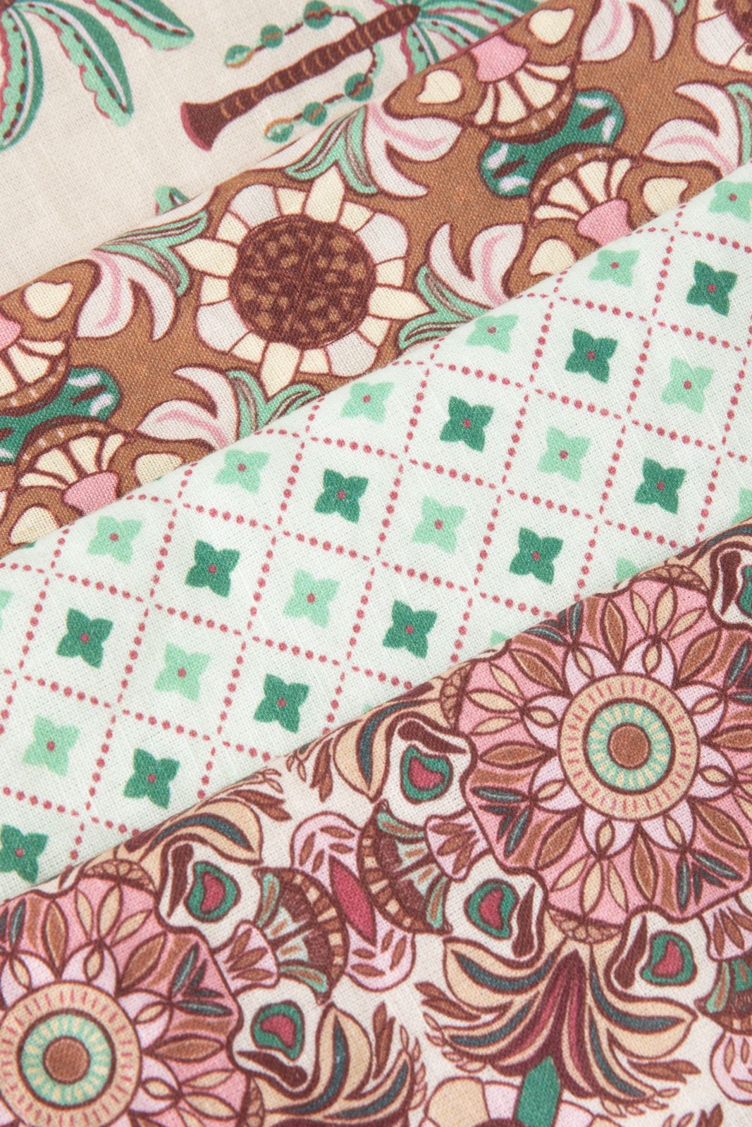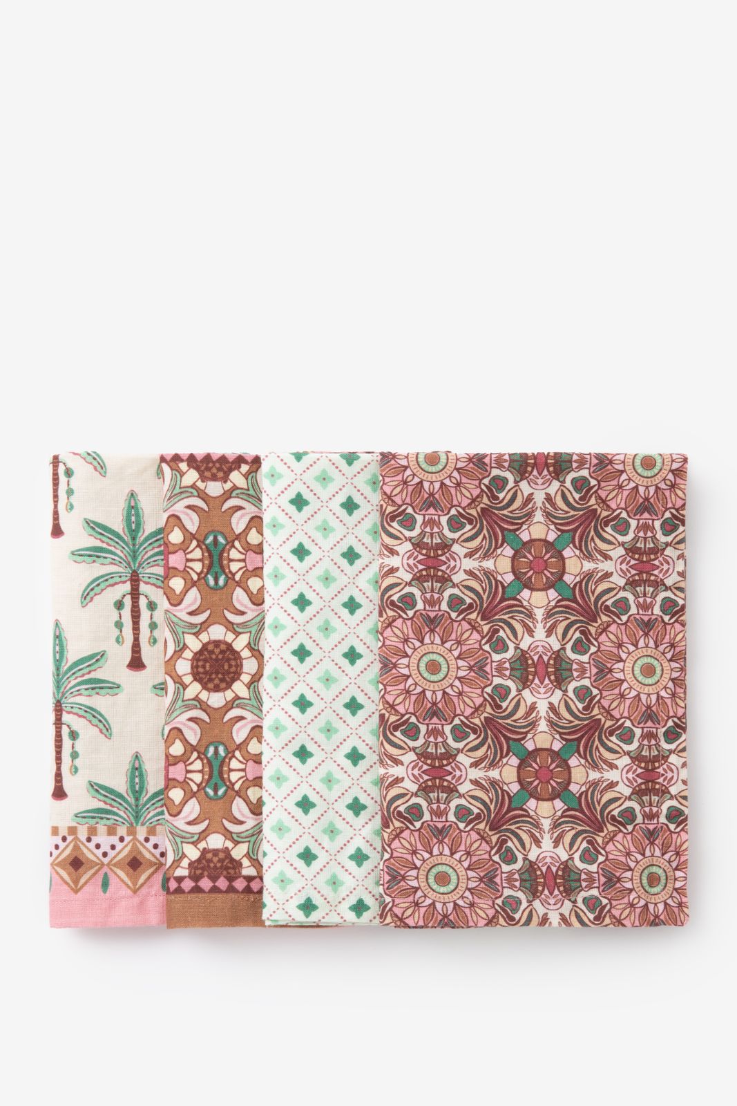 Set van 4 servetten met print van Sissy-Boy. De set servetten bestaat uit vier verschillende prints met palmbomen, bloemen en roze patronen. Afmeting: 40x40 cm. Wasadvies: wassen op 40°C, strijken op gemiddelde temperatuur, niet bleken en niet drogen in de droger. Materiaal: 50% linnen, 50% katoen.