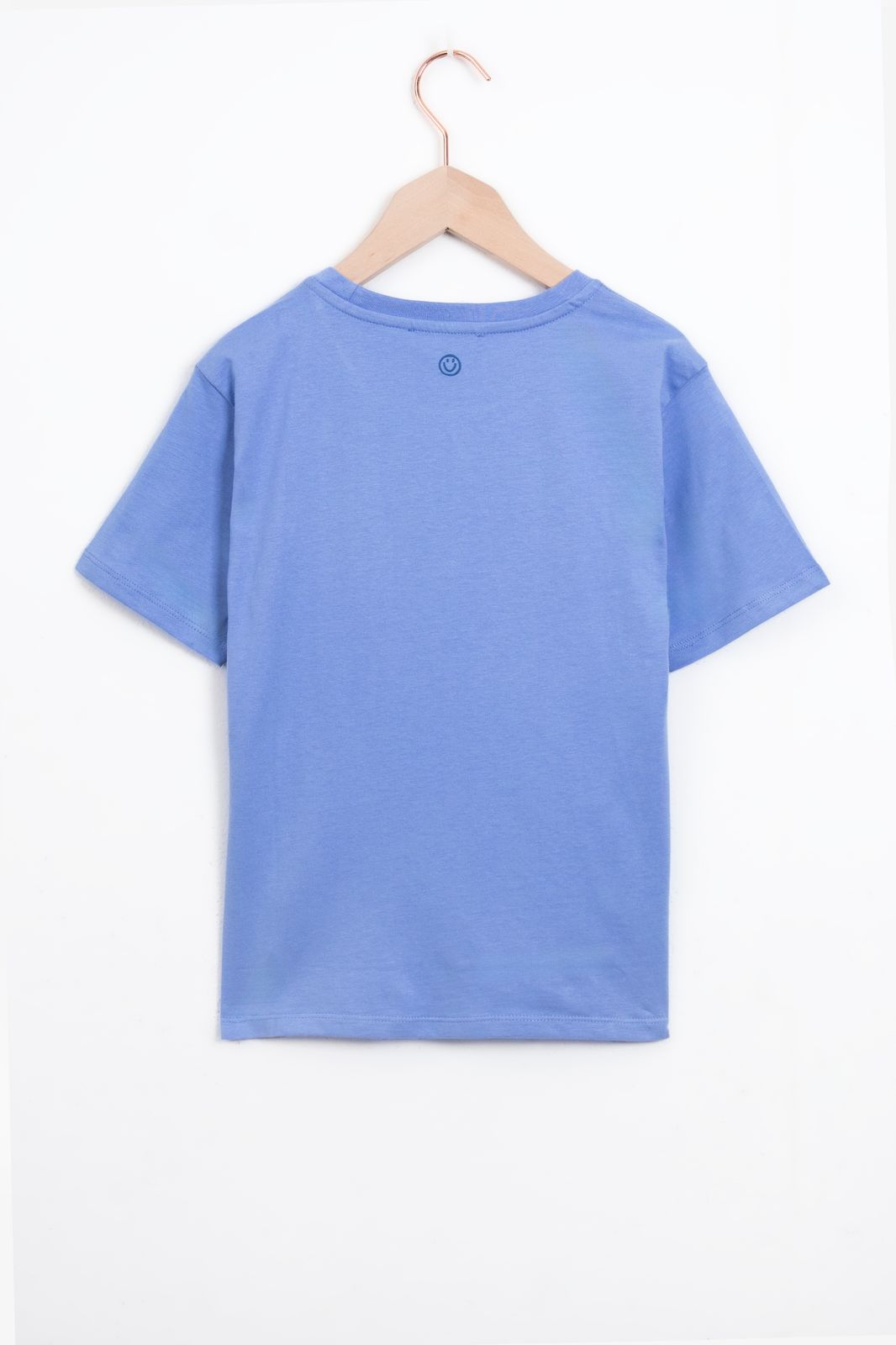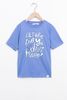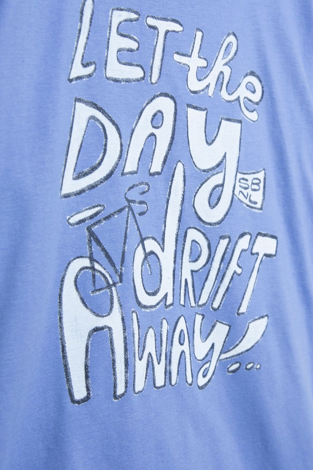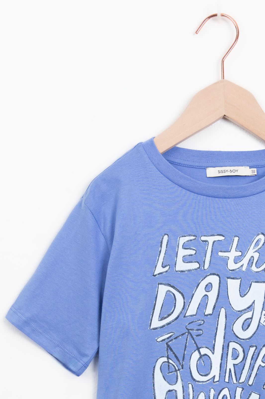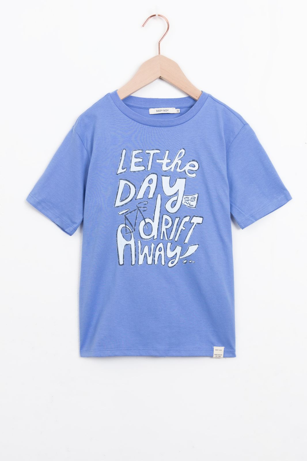 Blauw oversized T-shirt met print van Sissy-Boy. Het T-shirt heeft korte mouwen en een ronde hals met een ribboord. Op de voorkant van het T-shirt staat de witte tekst 'Let the day drift away'. Een perfect T-shirt om in laagjes te dragen! Materiaal: 100% organisch katoen.