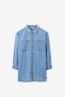 Blauwe denim jurk van Sissy-Boy. De jurk heeft lange mouwen, een kraag, borst zakken en een doorknoopsluiting. Materiaal: 100% katoen.