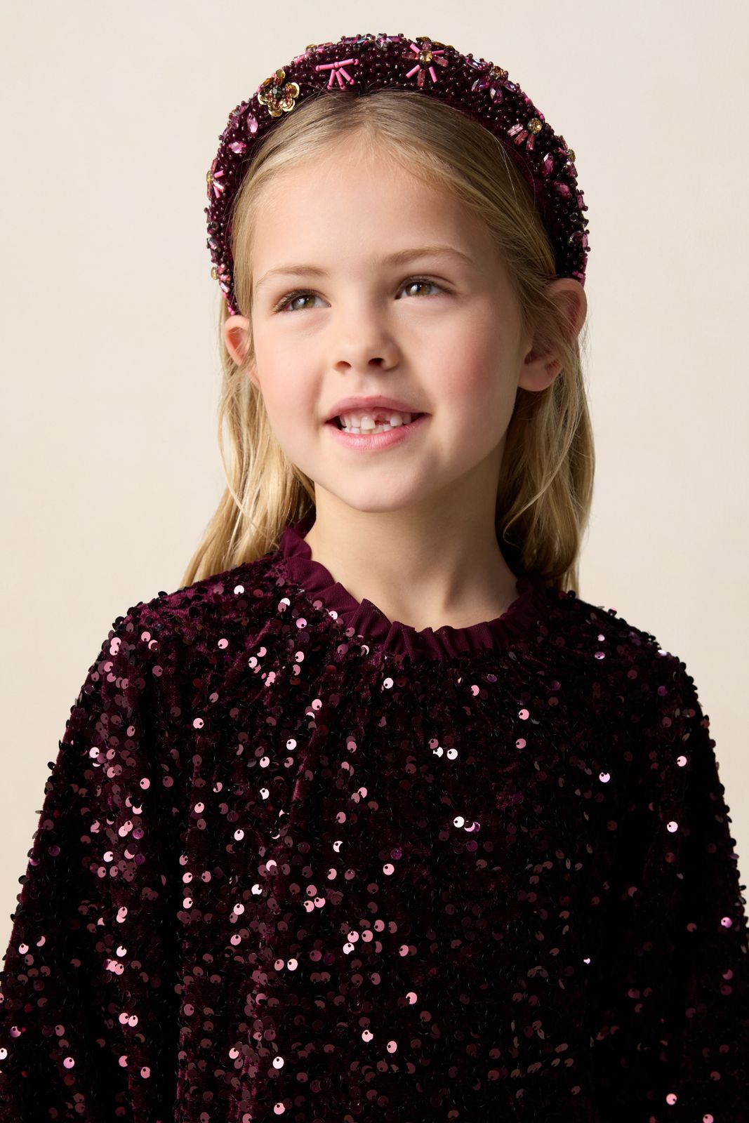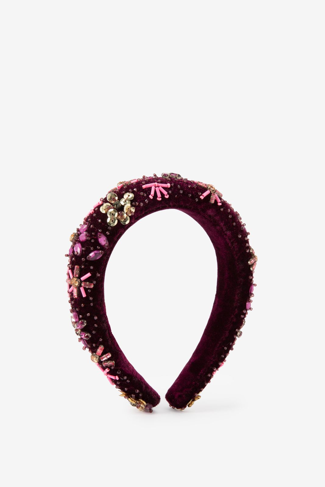 Donkerrode haarband met pailletten van Sissy-Boy. De haarband heeft een donkerrode kleur met all-over roze en gouden glitters en pailletten. Verder is de haarband gemaakt van een velvet kwaliteit stof. Materiaal: 100% polyester