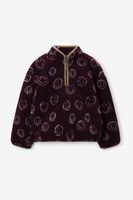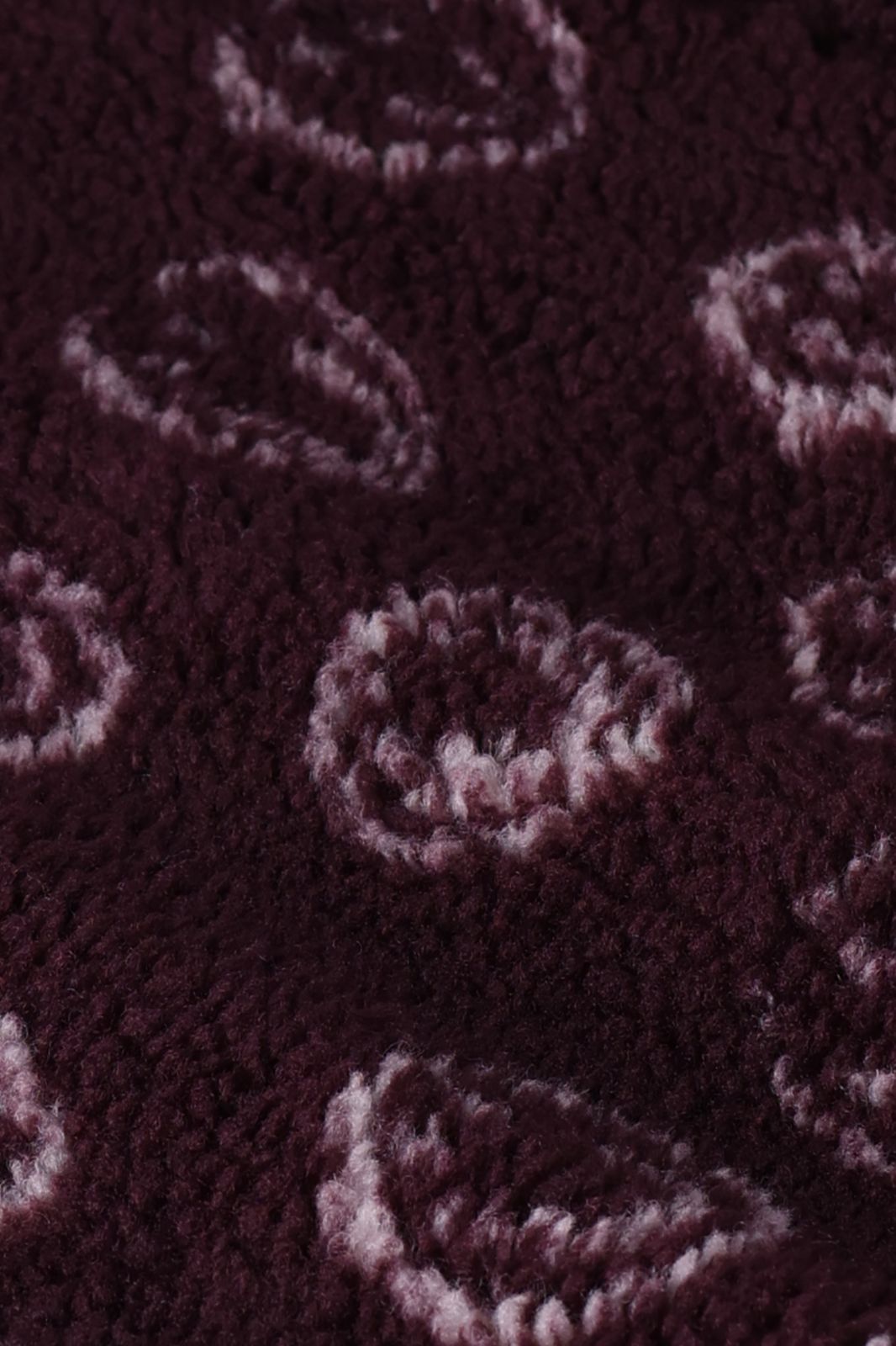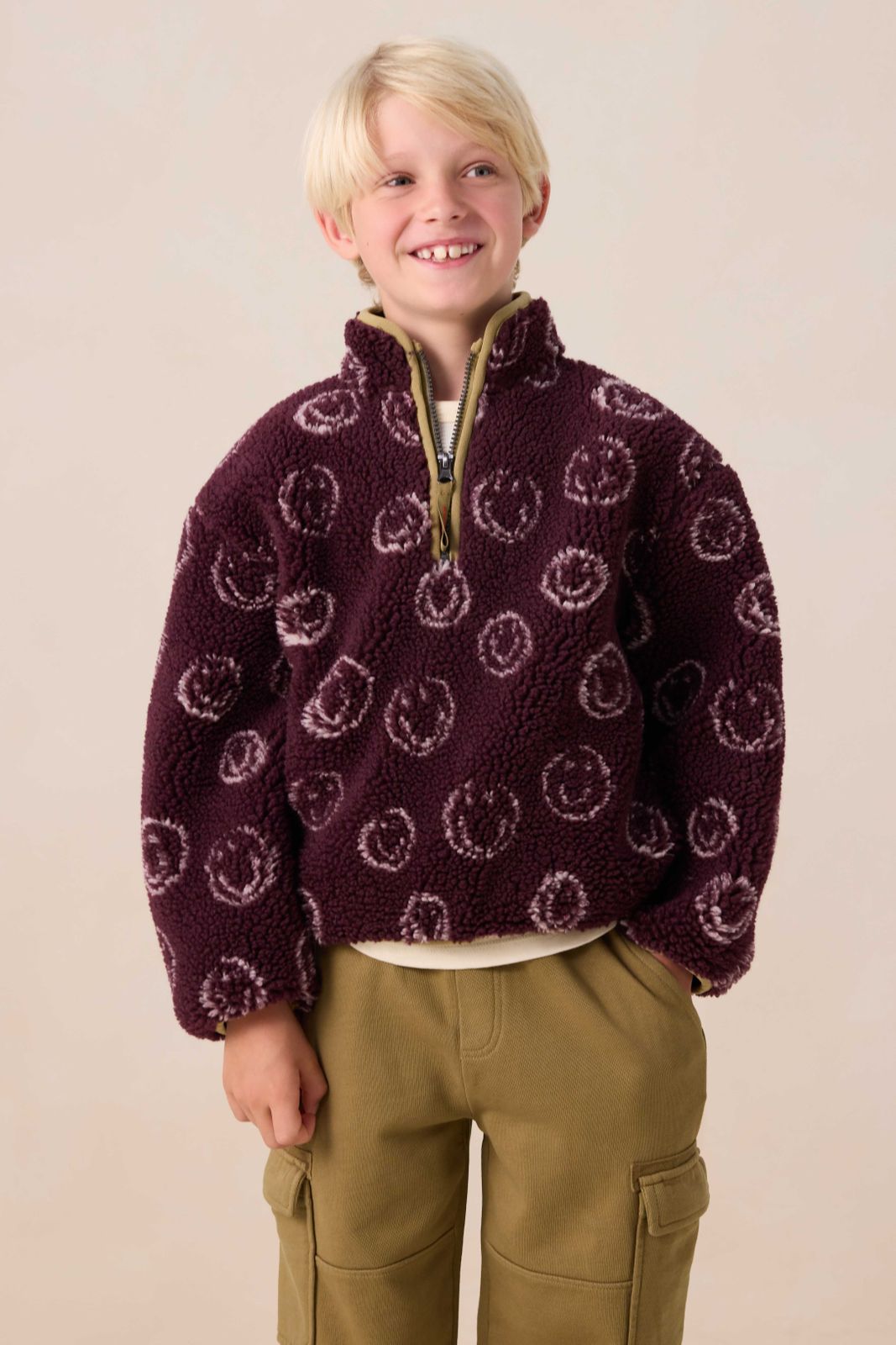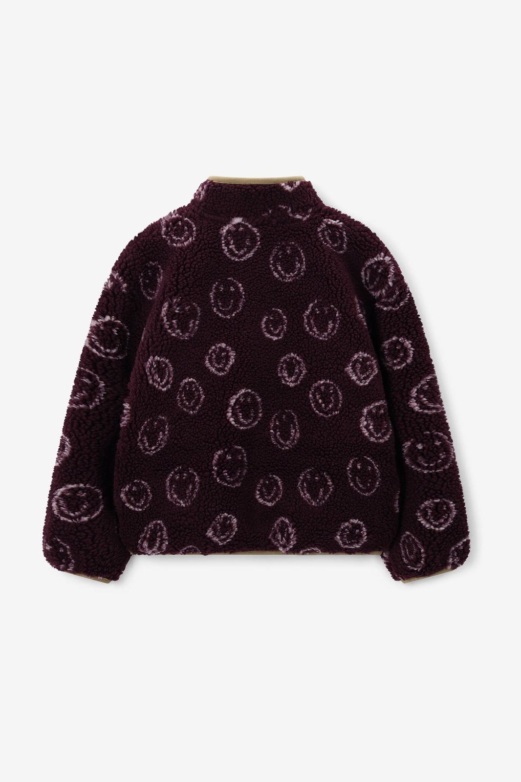 Donkerrode teddy sweater met smileys van Sissy-Boy. De sweater heeft lange mouwen, een hoge halslijn, een ritssluiting en een relaxed fit. Daarnaast heeft het een bordeaux rode kleur, groene details bij de ritssluiting en een all-over smiley patroon in de teddy stof verwerkt. Materiaal: 100% polyester.